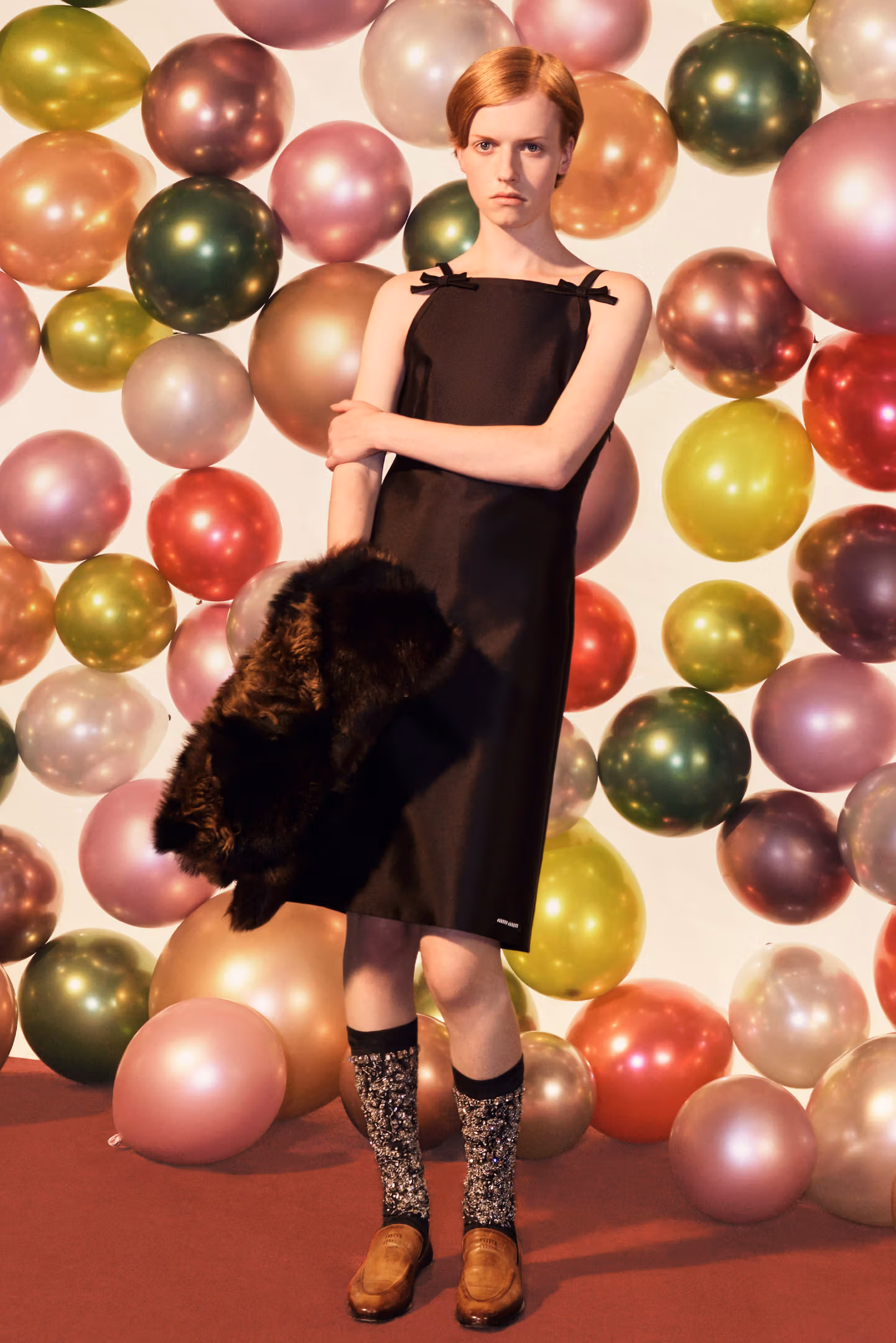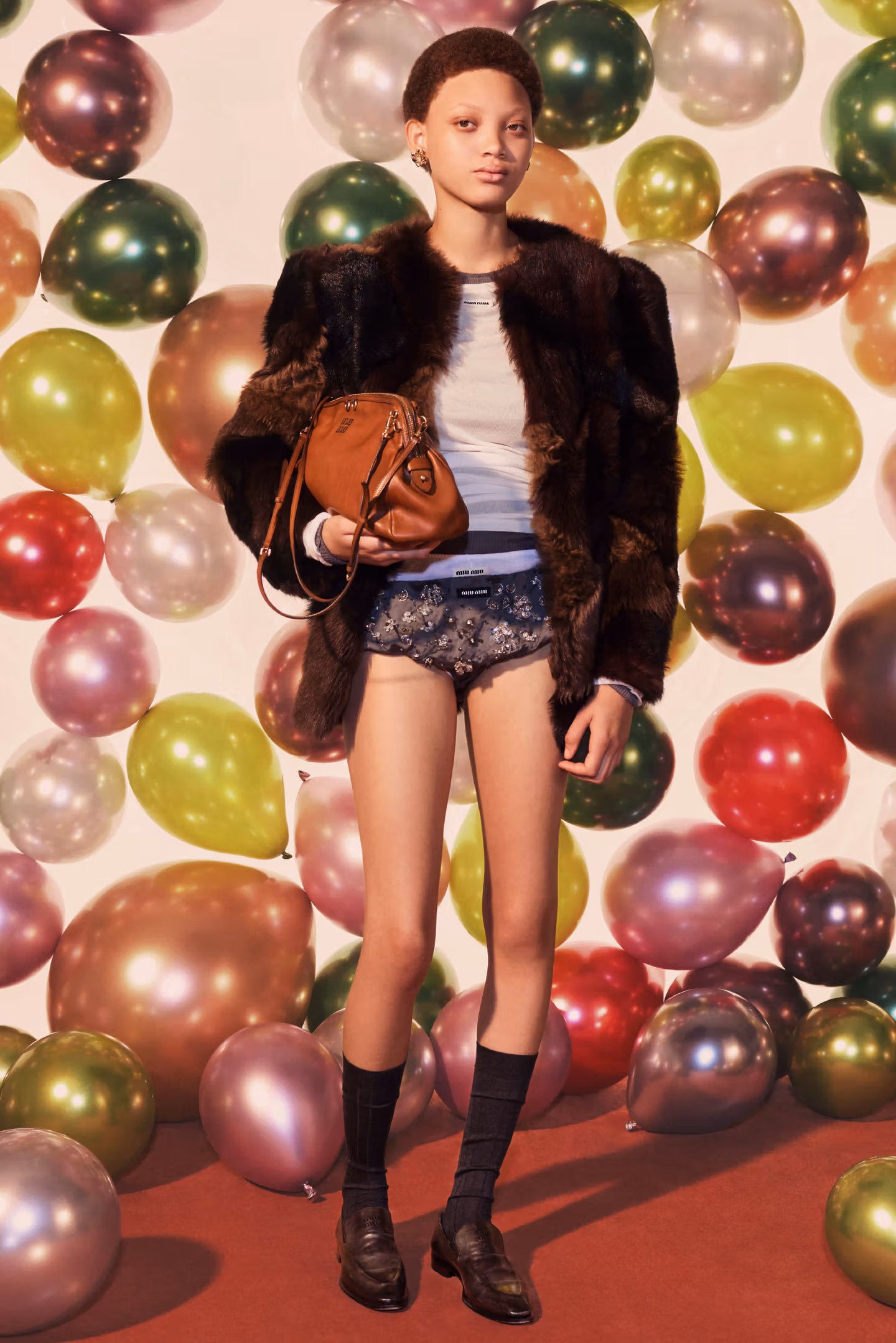 The proposal aims to “uplift and empower”. For this reason, it leaves behind traditional festive aesthetics and opts for a bolder wardrobe. Provocative micro-shorts, crumpled satin, stoles and voluminous jackets take centre stage. The silhouettes are built through layering, contrasting textures and a dialogue between the intimate and the public that defines Miu Miu.