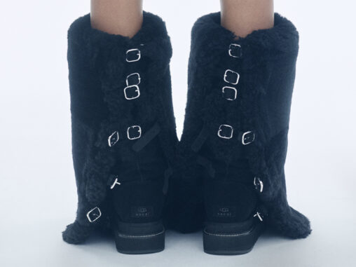True to her own imagination, Chitose Abe continues to explore duality, with designs that blend opposing concepts to create a new form of imperfect elegance. In this latest encounter, proportions are considerably exaggerated and UGG‘s iconic materials—ultra-soft suede and exposed shearling—are reimagined with a Sacainian approach.