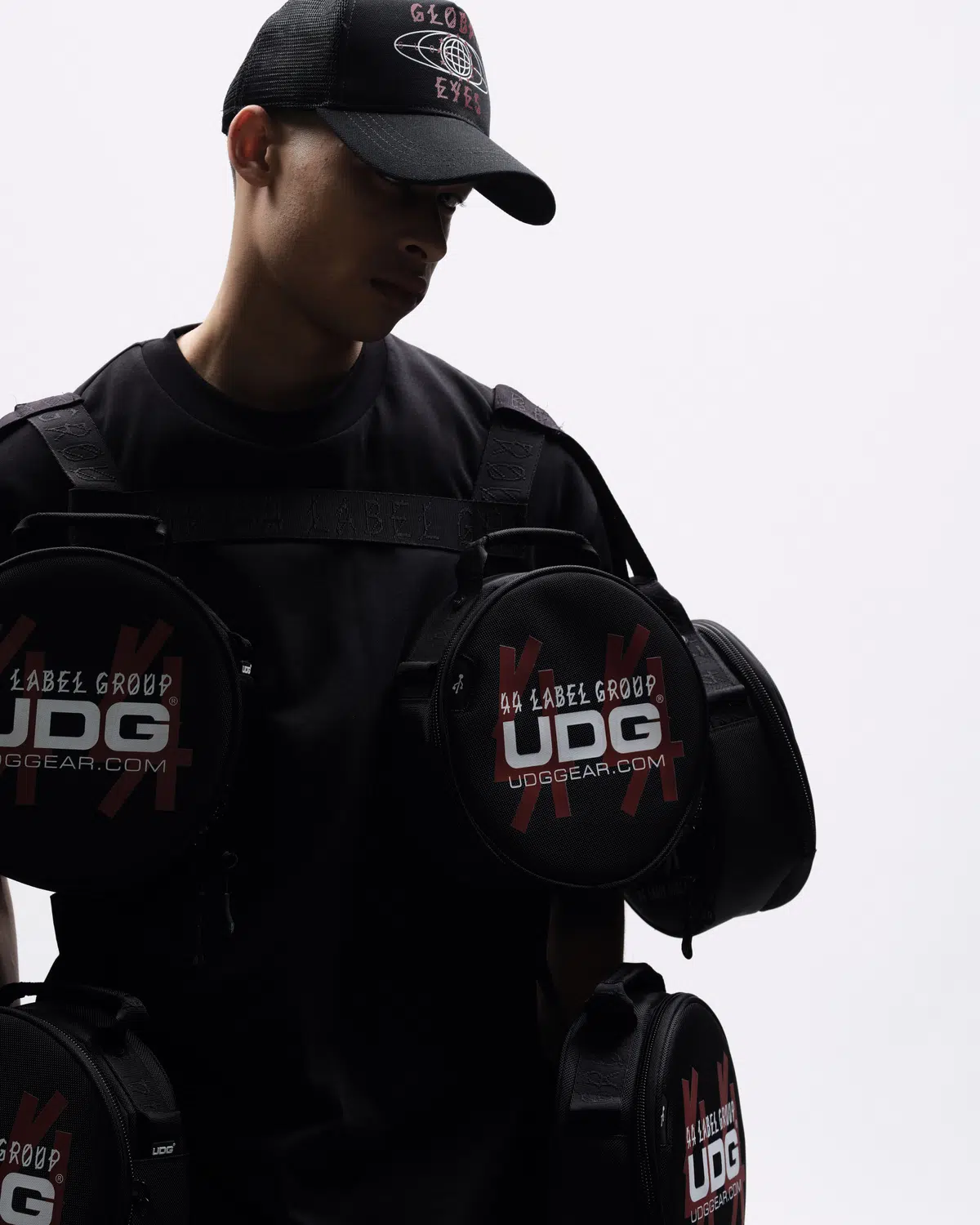 The club kids’ closet is filled with pure black pieces, distressed denim, textured rubber and rugged nylon. And it even brings the must-have accessory for the rave DJ. In collaboration with iconic DJ luggage brand UDG, he’s created a headphone case with strap and a fanny pack.