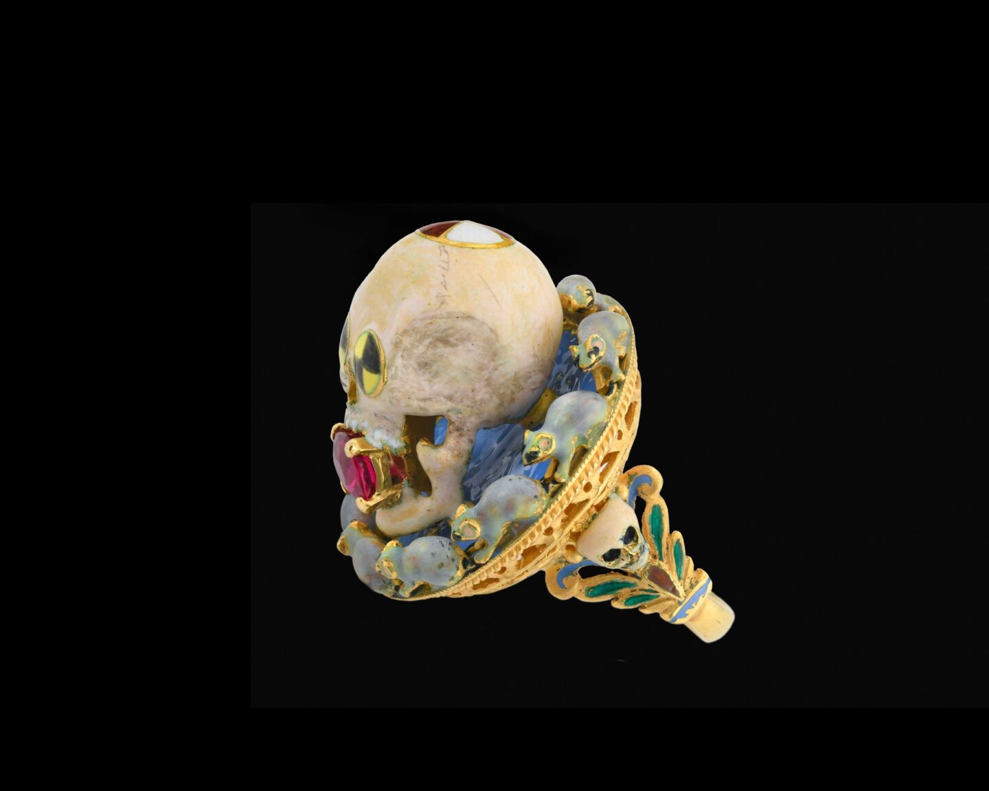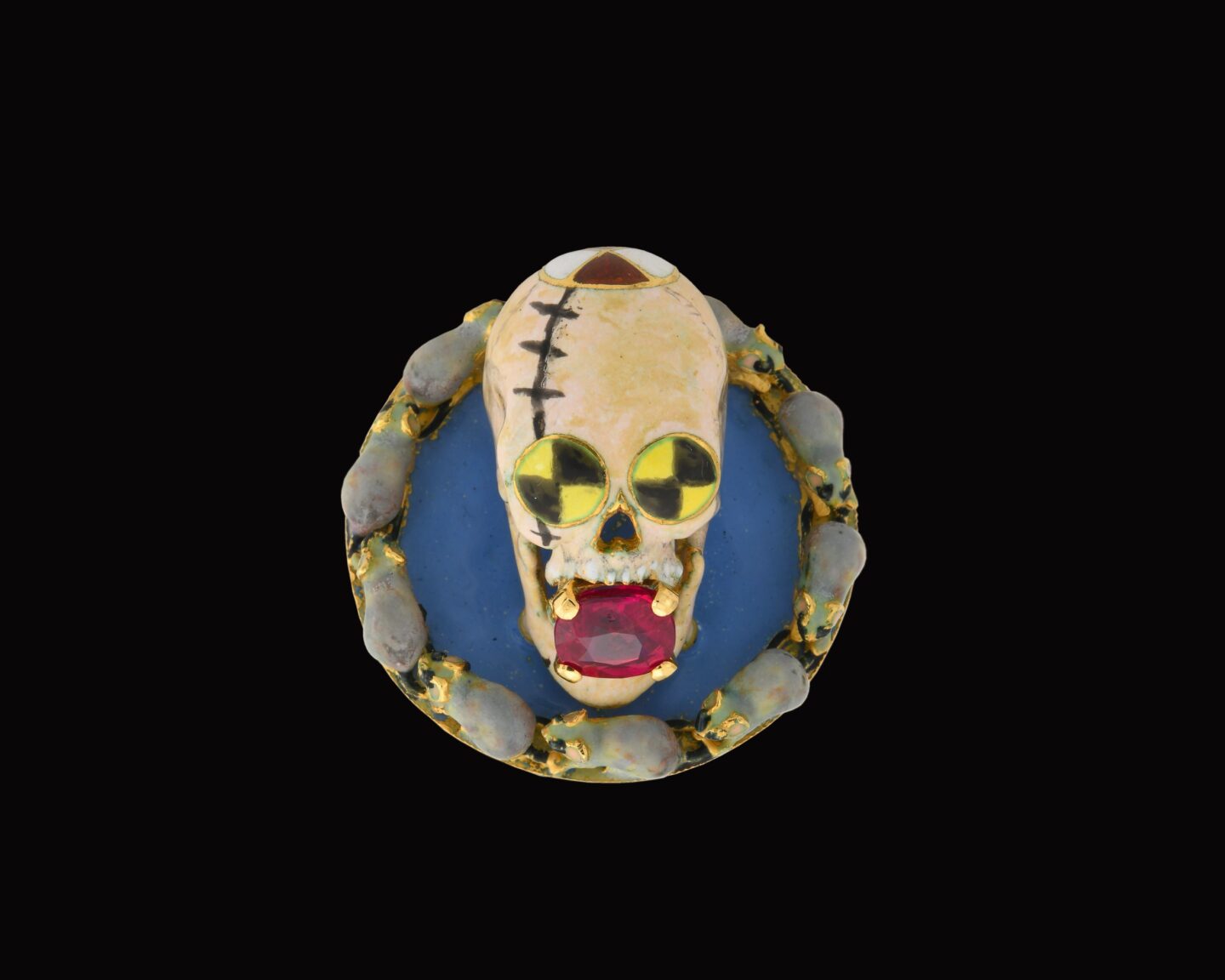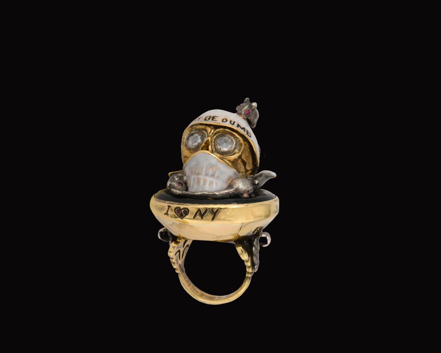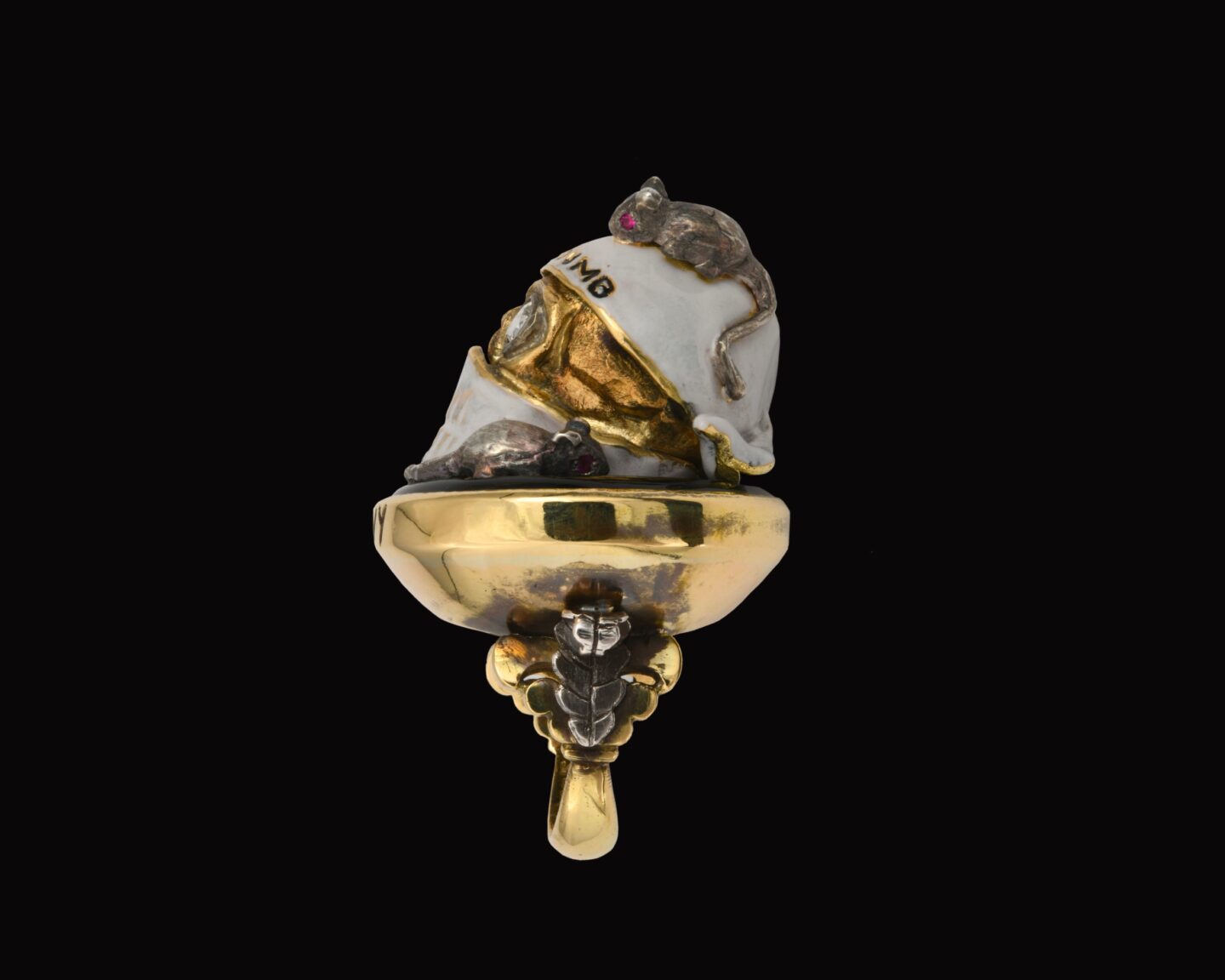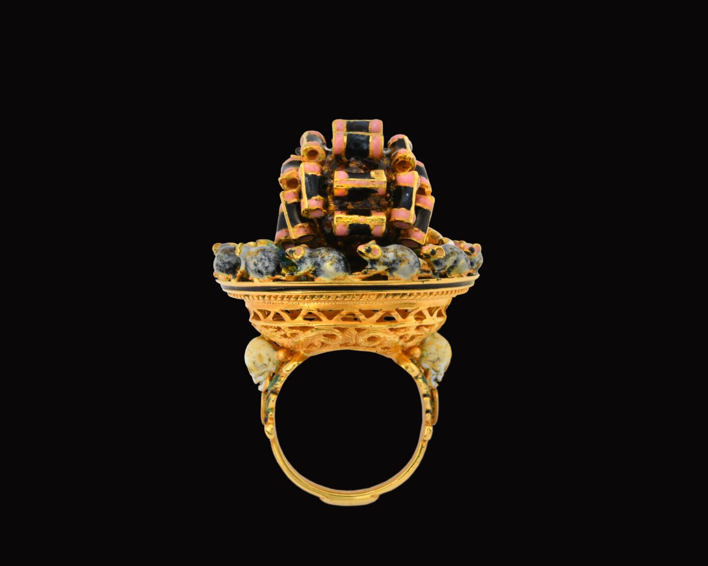 • DUMMY, made of 18-karat yellow gold and enamel, incorporates a baroque setting with ten rats and a 2.06-carat ruby held in its mouth.