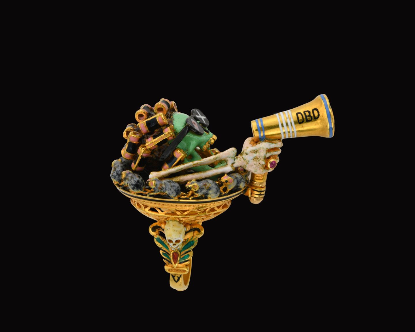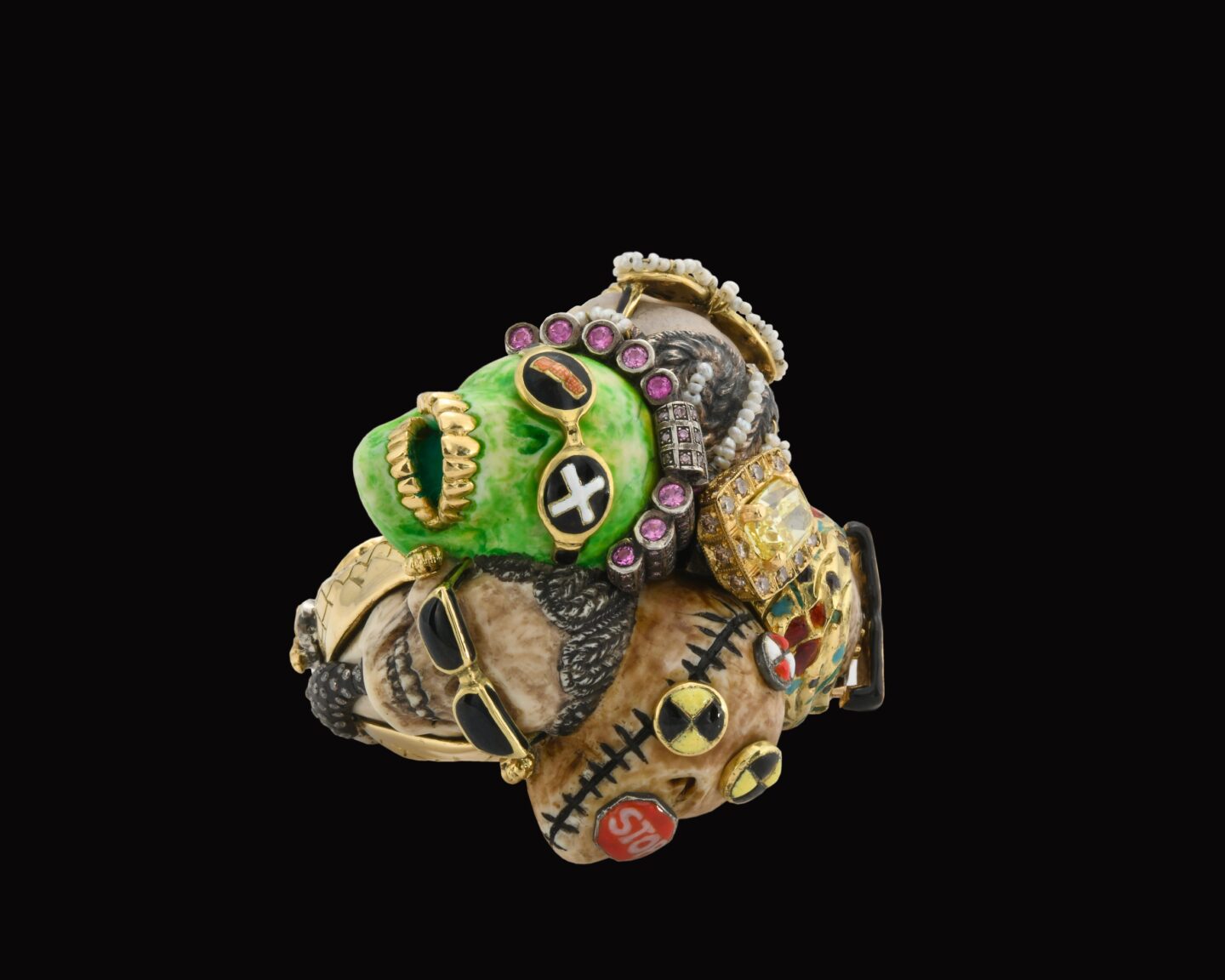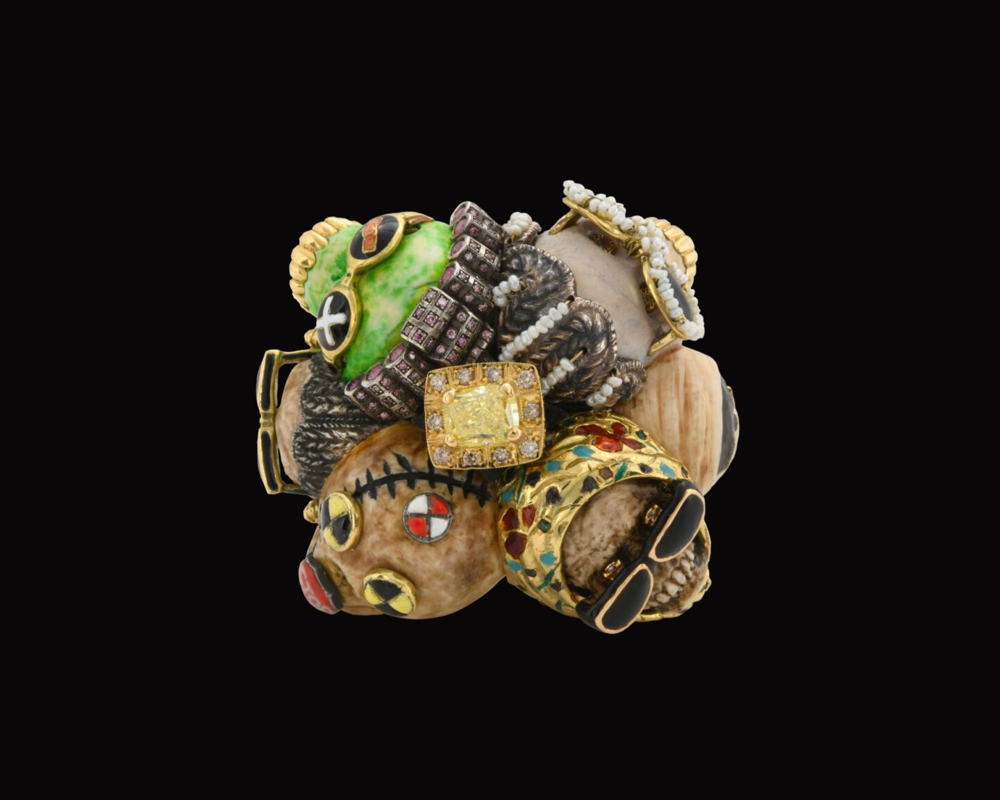 Each ring functions as a portable sculpture, combining traditional craft techniques with contemporary cultural references: