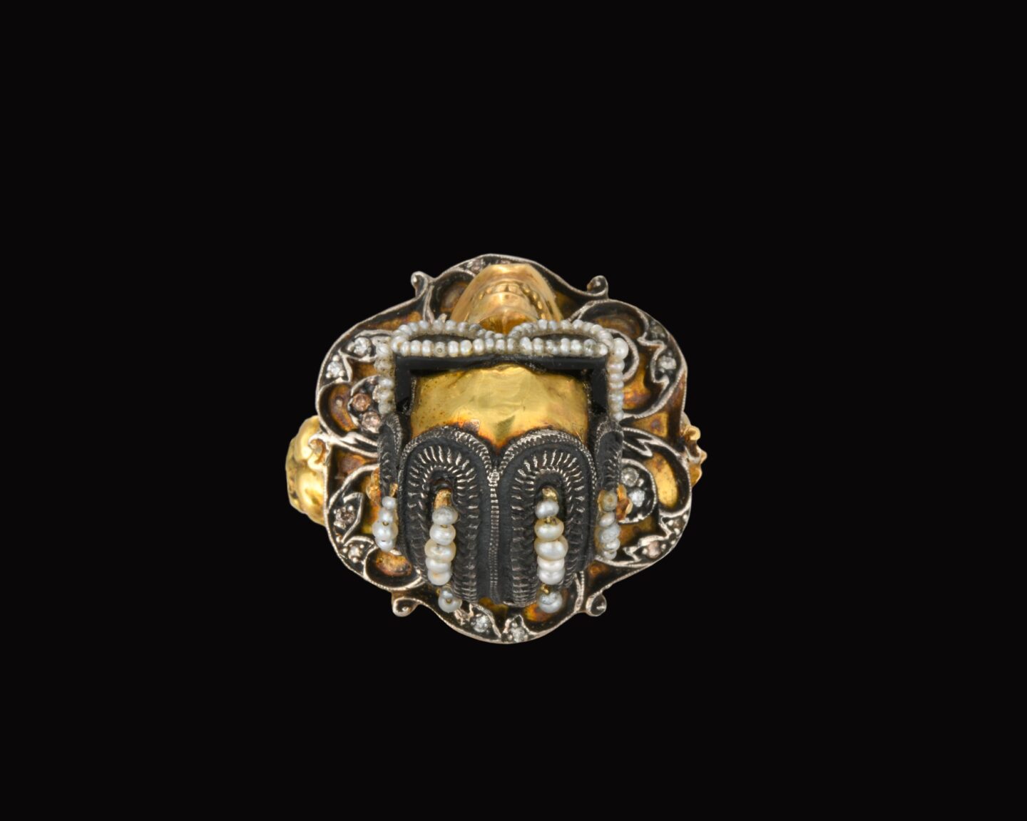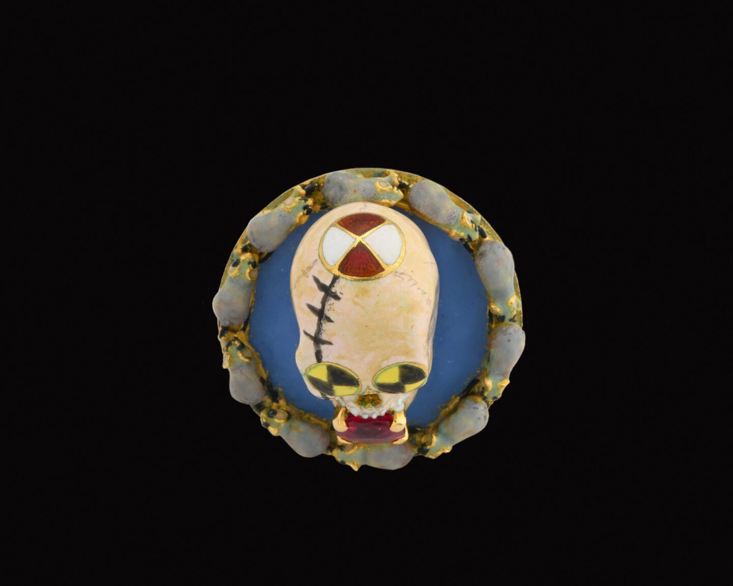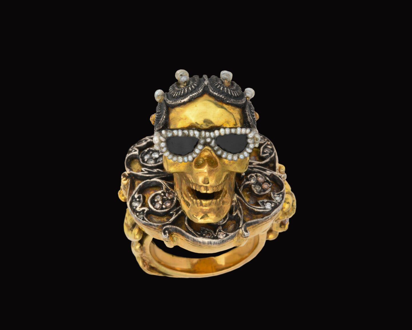 Each ring functions as a portable sculpture, combining traditional craft techniques with contemporary cultural references: