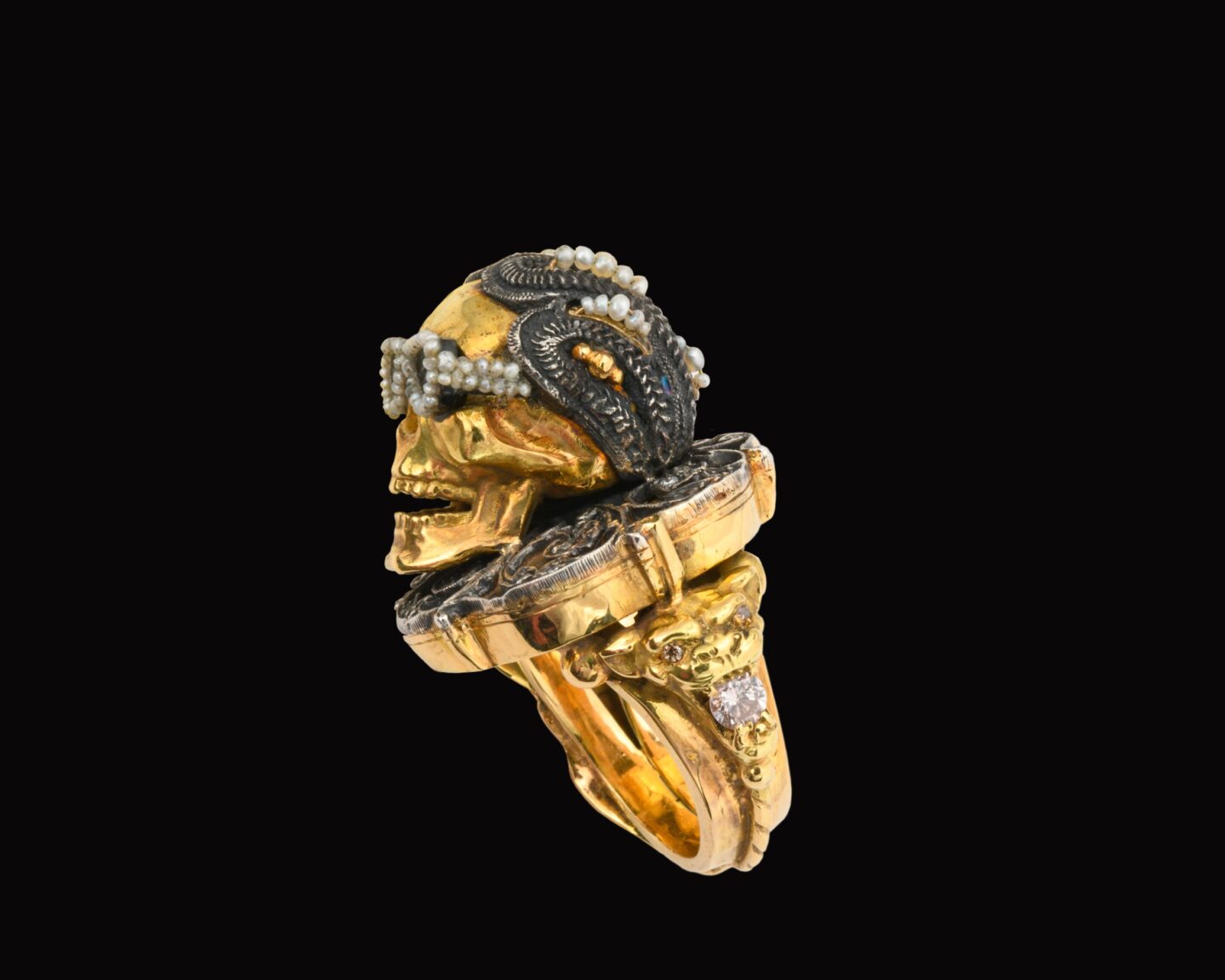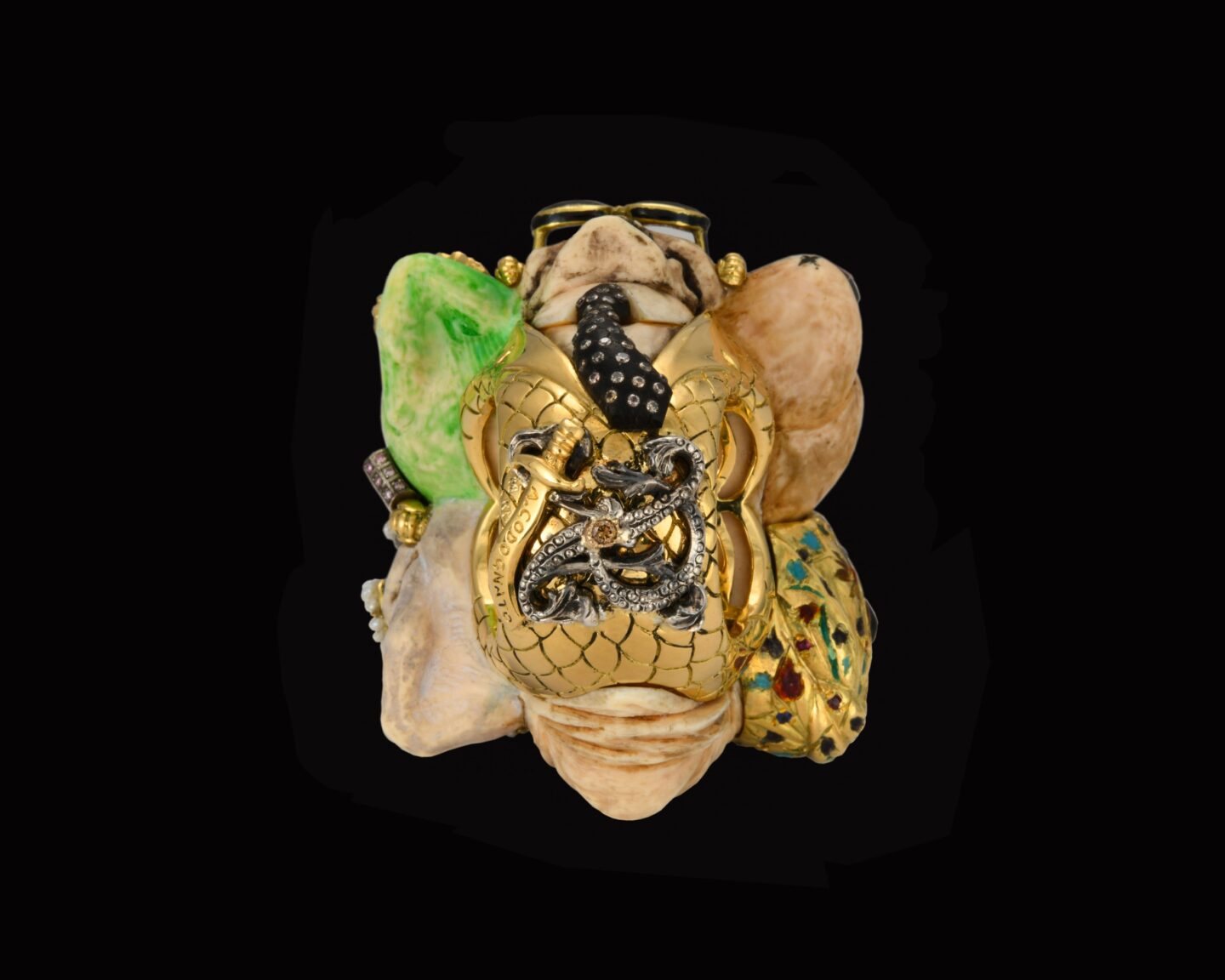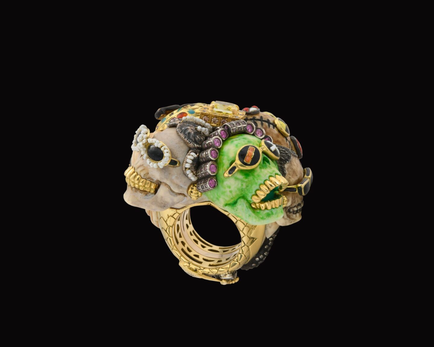 • GRIM takes its cue from the green witch in The Wizard of Oz. The ring, initially conceived as two separate pieces, ended up as a single structure of gold and enamel, with modified glasses and complex technical details.