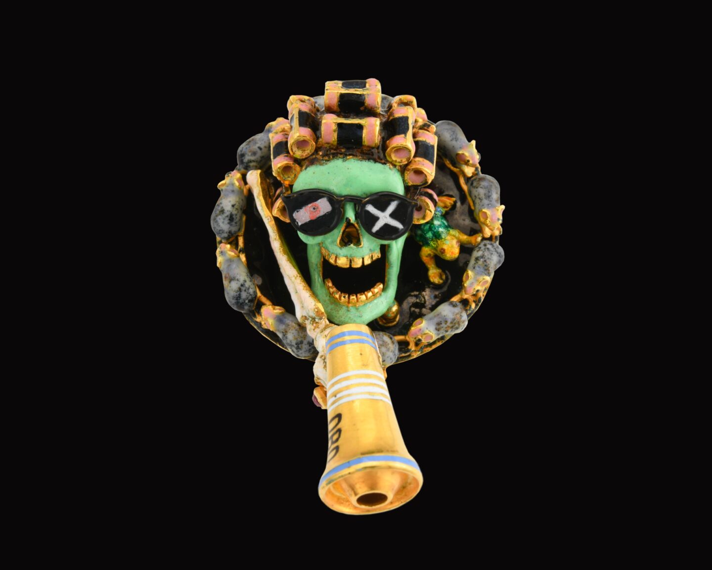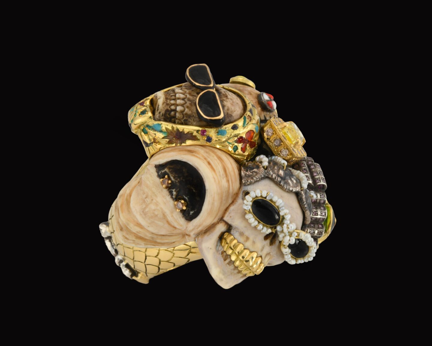 • Six Headed,  the centerpiece, is carved from mammoth bone and brings together the six personalities of the album in a single object. Gold, enamel, and precious stones are layered in a work conceived more as a statement than as a mass-produced item.