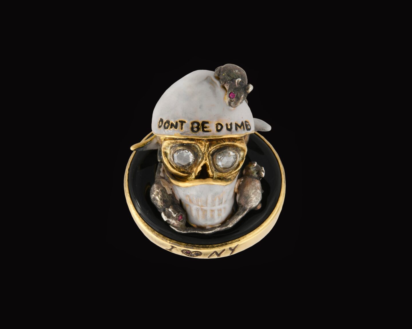 From that point on, Rocky proposed a more ambitious creative exercise to Codognato: to translate the six alter egos that articulate the narrative universe of DON’T BE DUMB into jewelry. Each character became a different skull ring, shaping a collection composed of seven main pieces.