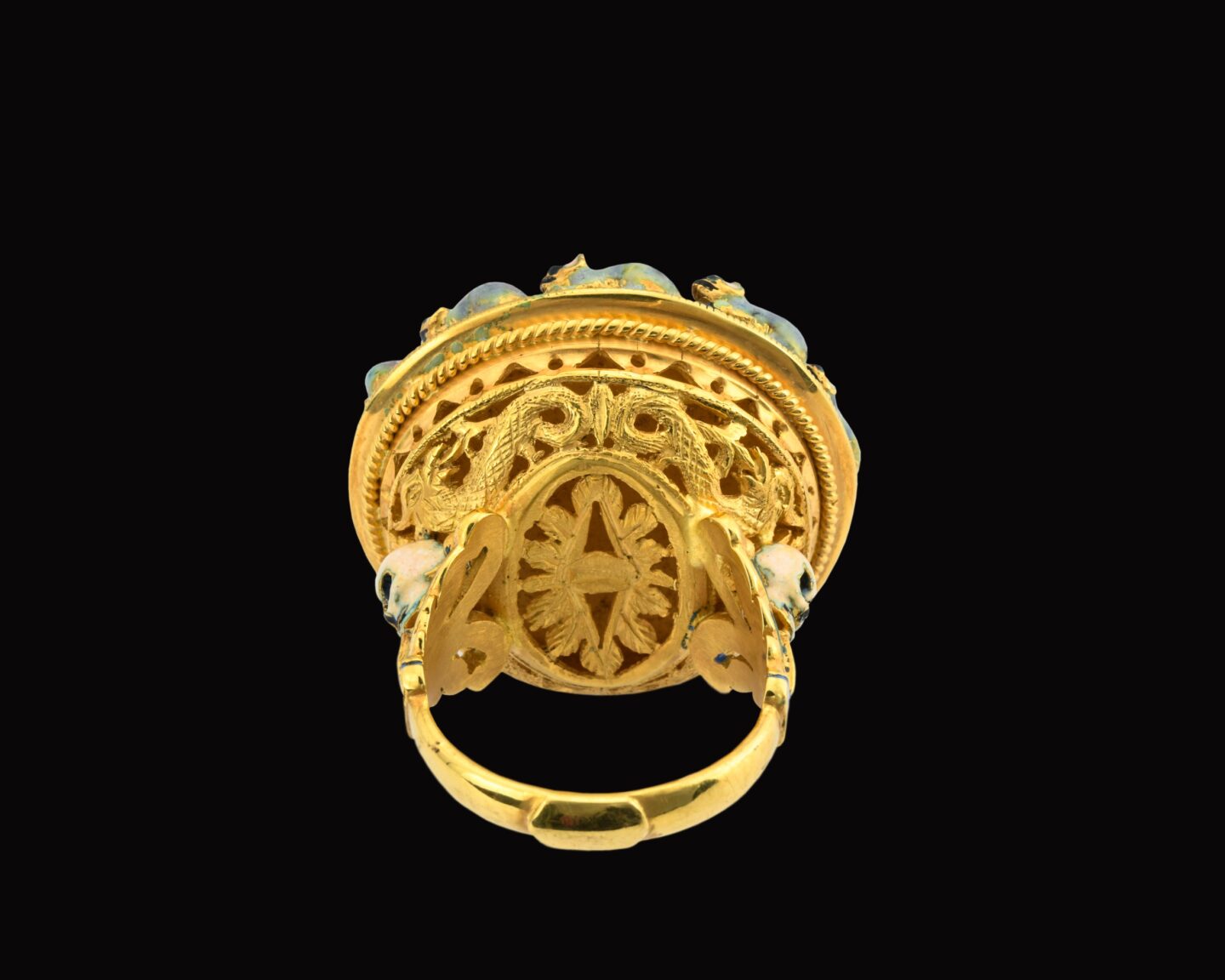 • RUGAHAND is inspired by a Byzantine box preserved in the Topkapi Palace in Istanbul. It includes natural pearls, onyx, a Madonna with a red rose, and a panther with a champagne diamond in its mouth.