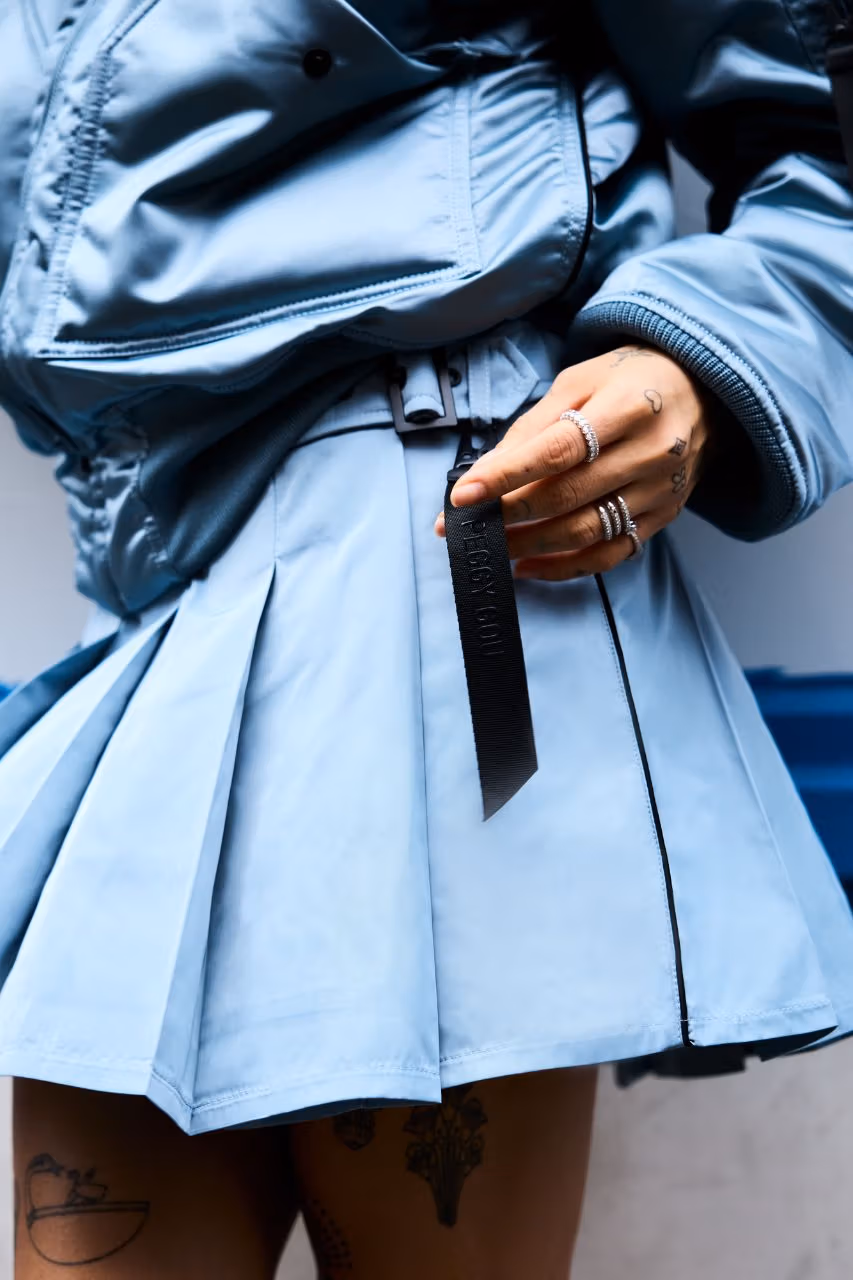 The collection includes a pleated miniskirt in baby blue and black. It also features a padded cosmetic bag designed for daily commutes and for carrying everyday essentials. Even so, it’s the outerwear that shapes the character of this collaboration. The CWU-45 and Cocoon Bomber jackets return reimagined to suit any moment. The CWU-45 appears in blue for daytime plans, while the Cocoon, with its high collar and enveloping silhouette, provides warmth and presence once night falls.