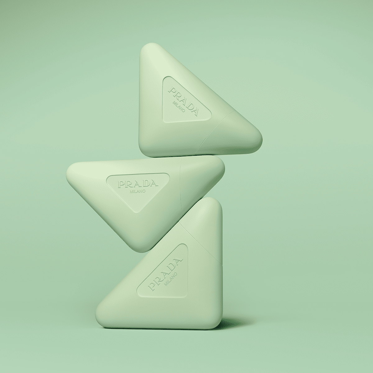 The triangular case combines clean visual lines with a distinctive touch in Prada’s green triangle. The shape fits the hand and the screw-top allows for easy use. Prada The Hand is a product where care and design meet, reflecting the brand’s vision.