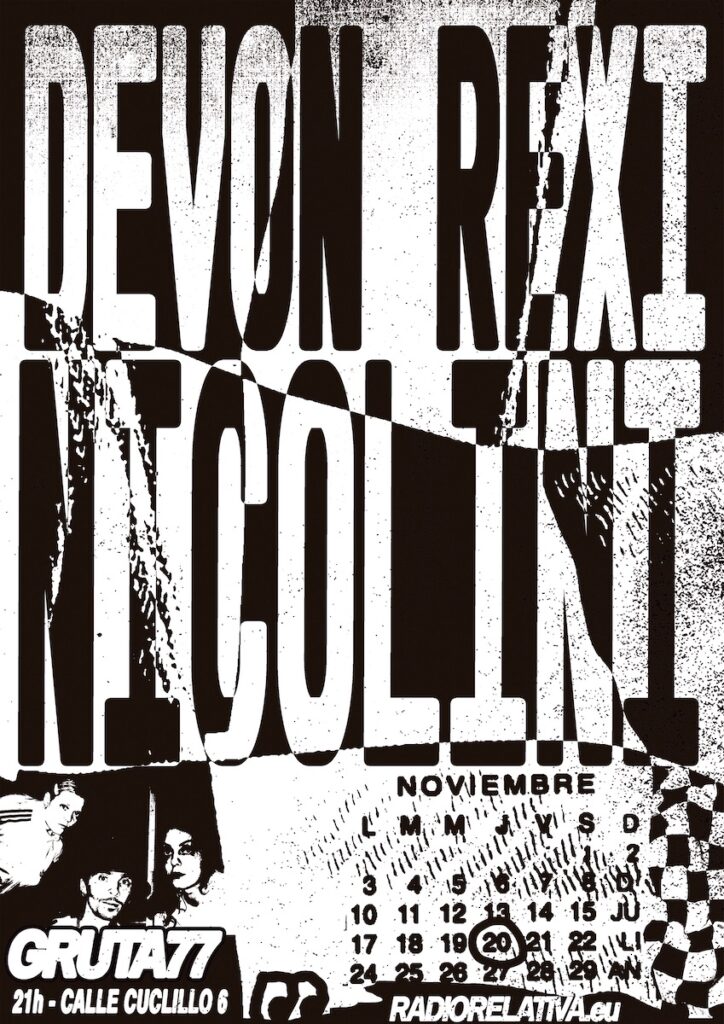 On the evening of 20 November 2025, Gruta 77 will host an event that places Madrid within the European circuit of advanced sound proposals. With the support of Radio Relativa, the Dutch trio Devon Rexi and the solo project Nicolini will present in the capital two live sets that offer a close-up understanding of how contemporary experimentation dialogues with rhythm-based musical traditions.