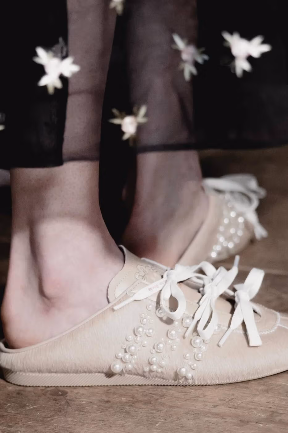 One detail that stands out is the logo. They combined the adidas symbol with Simone Rocha’s signature bow. This new design appears on dresses, knee-high socks and large weekend bags. The shoes include Mary Jane styles with bow-shaped laces, ballerina-style trainers with crystals on the heel and other styles with small pearl details.