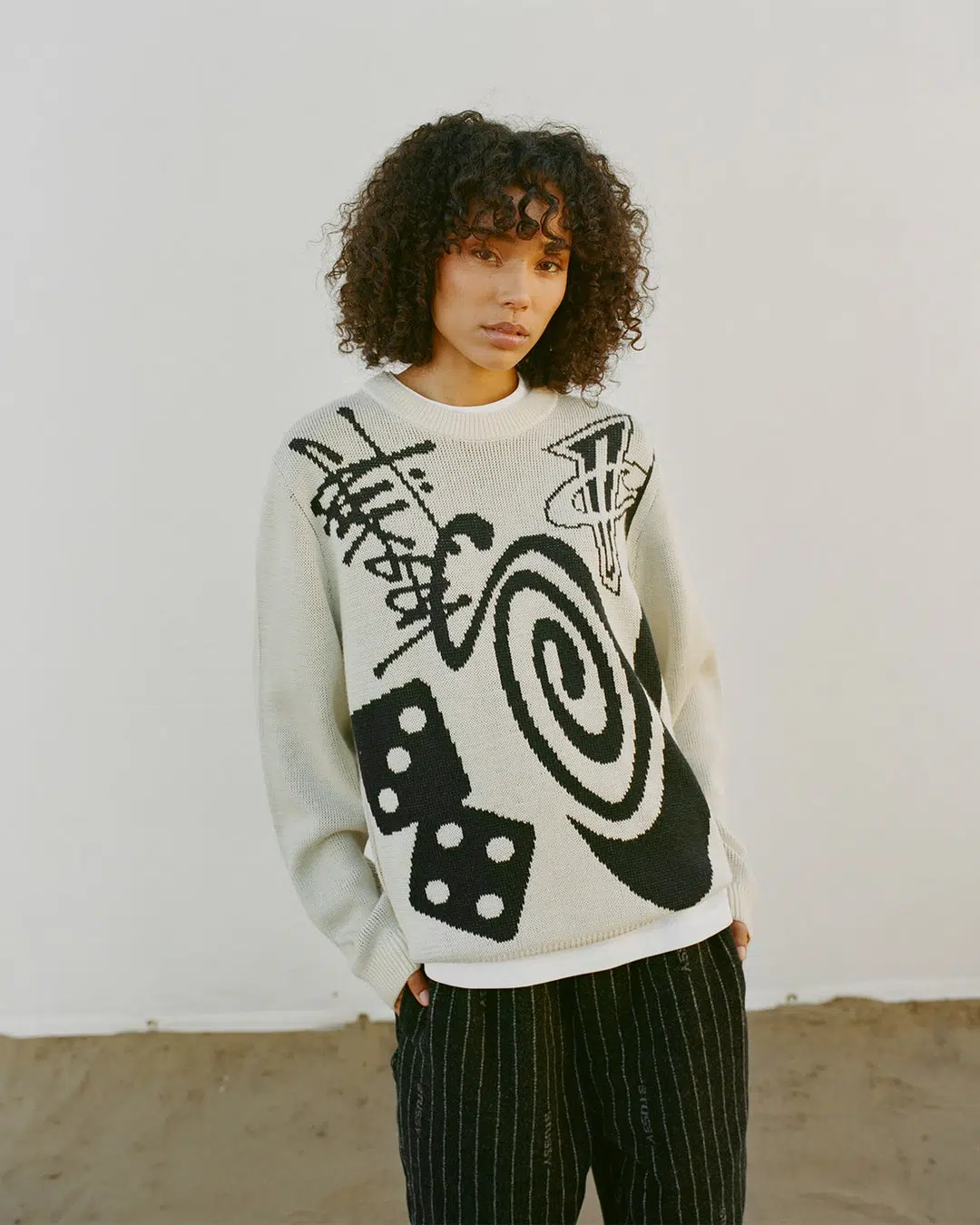 A selection of relaxed pieces that combine Nike‘s sporty style and Stüssy‘s Californian essence. Highlights include the zip-up hoodie with XXL-sized swoosh on the back and a combination of both logos on the front. The knitted jersey with the spiral S emblem and the iconic dice is also one of the key elements of the launch.