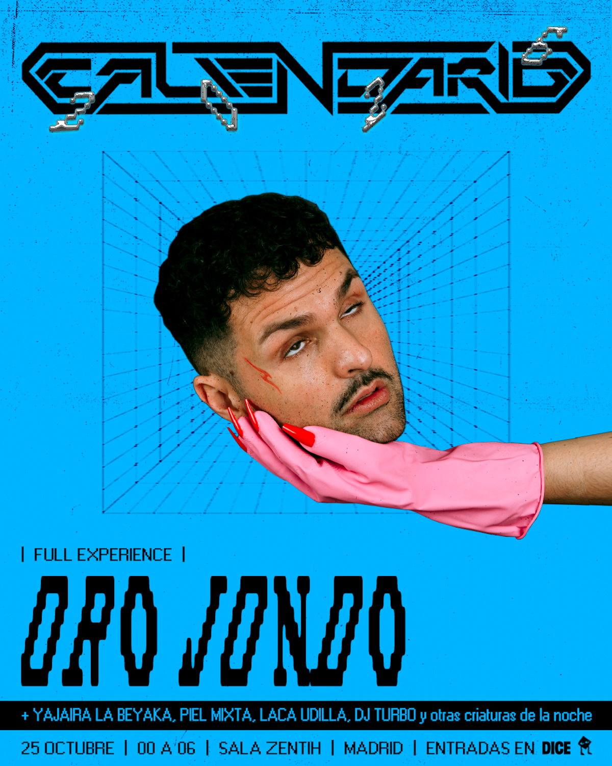 Headlining the night is ORO JONDO (@orojondo), the multidisciplinary artist behind the project. After performing at major festivals such as BBK LIVE and Sónar, he returns to Madrid with a dark, percussive hard groove set, accompanied by high-voltage visuals and gogós, creating a full-blown sensory experience.
