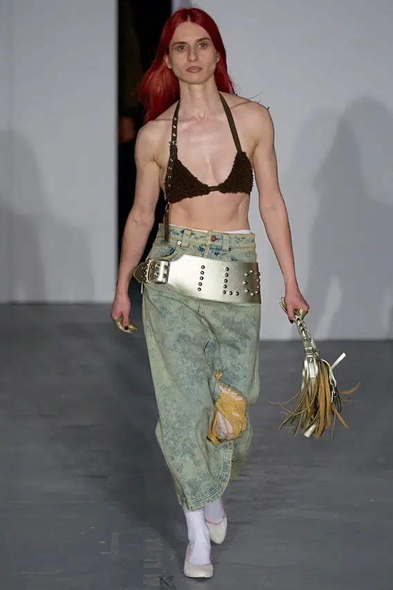 Satin ensembles were frayed at the edges and included swinging chains and pearl belts alongside voluminous dresses accented with oversized lapels, ruffles and ribbons. Fringed leather jackets, bras, handbags and whips were out of this sailor vibe.