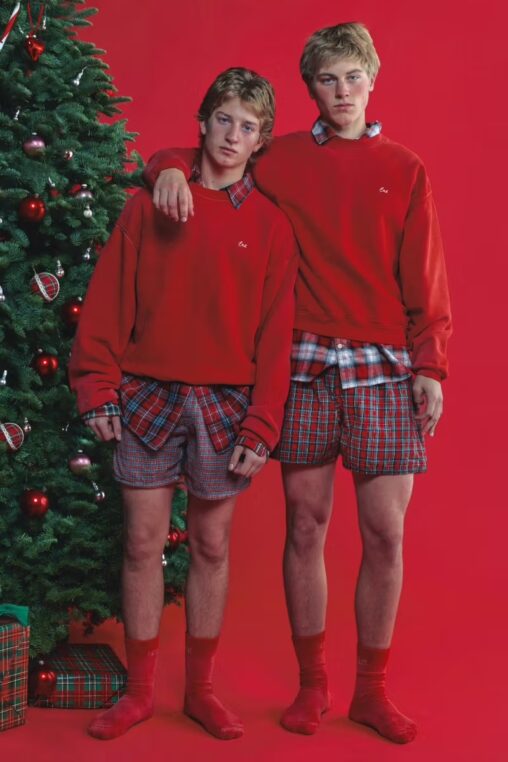 La línea mezcla referencias vintage con acabados cuidados, dando forma a una visión de lujo relajado y artesanal. La paleta cromática gira en torno a rojos desgastados por el sol, tonos chocolate profundos y colores naturales de inspiración orgánica, pensados para la temporada festiva.