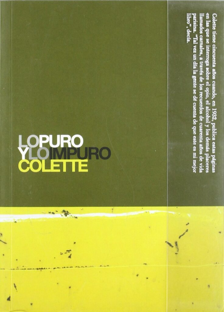 Lo puro y lo impuro (1941) de Colette es una obra de memorias y reflexiones sobre los placeres carnales, el opio y la vida parisina a lo largo de treinta años. A través de retratos de personajes «monstruosos» (mujeres que aman a mujeres, donjuanes), la autora explora la complejidad del deseo sensual y la distinción entre lo puro y lo impuro.