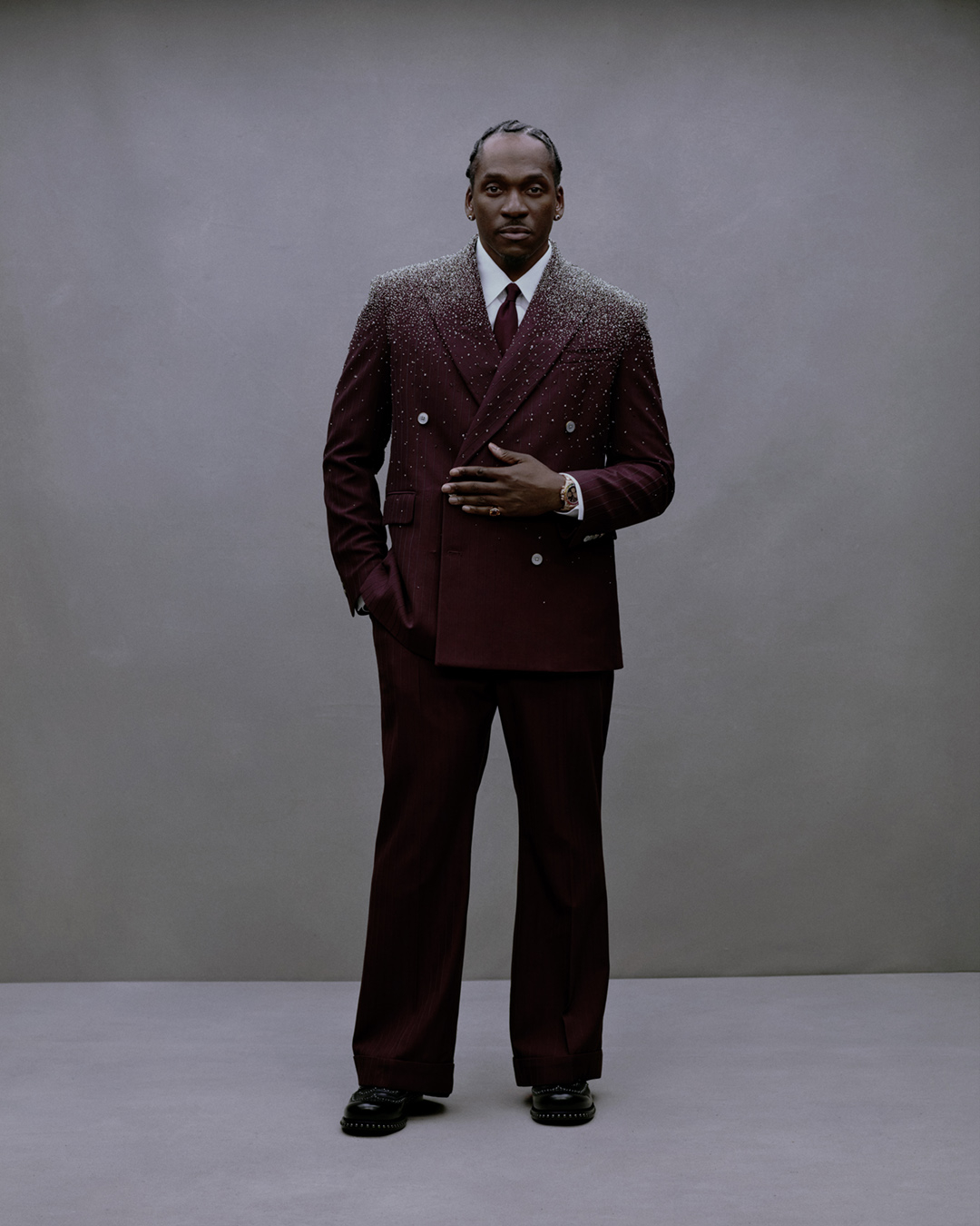 El aclamado rapero se enfundó en una chaqueta de chándal entallada y pantalones acampanados plisados a juego en lana bouclé texturizada en jacquard gris Príncipe de Gales con reflejos burdeos y adornada por todas partes con cristales bordados a mano y cuentas rojas. Este look se combinó con unas zapatillas LV ButterSoft Foot Sneakers de piel de cocodrilo negra y un Speedy P9 Bandoulière 40 de piel flexible negra y bordado a mano con perlas y cristales negros.