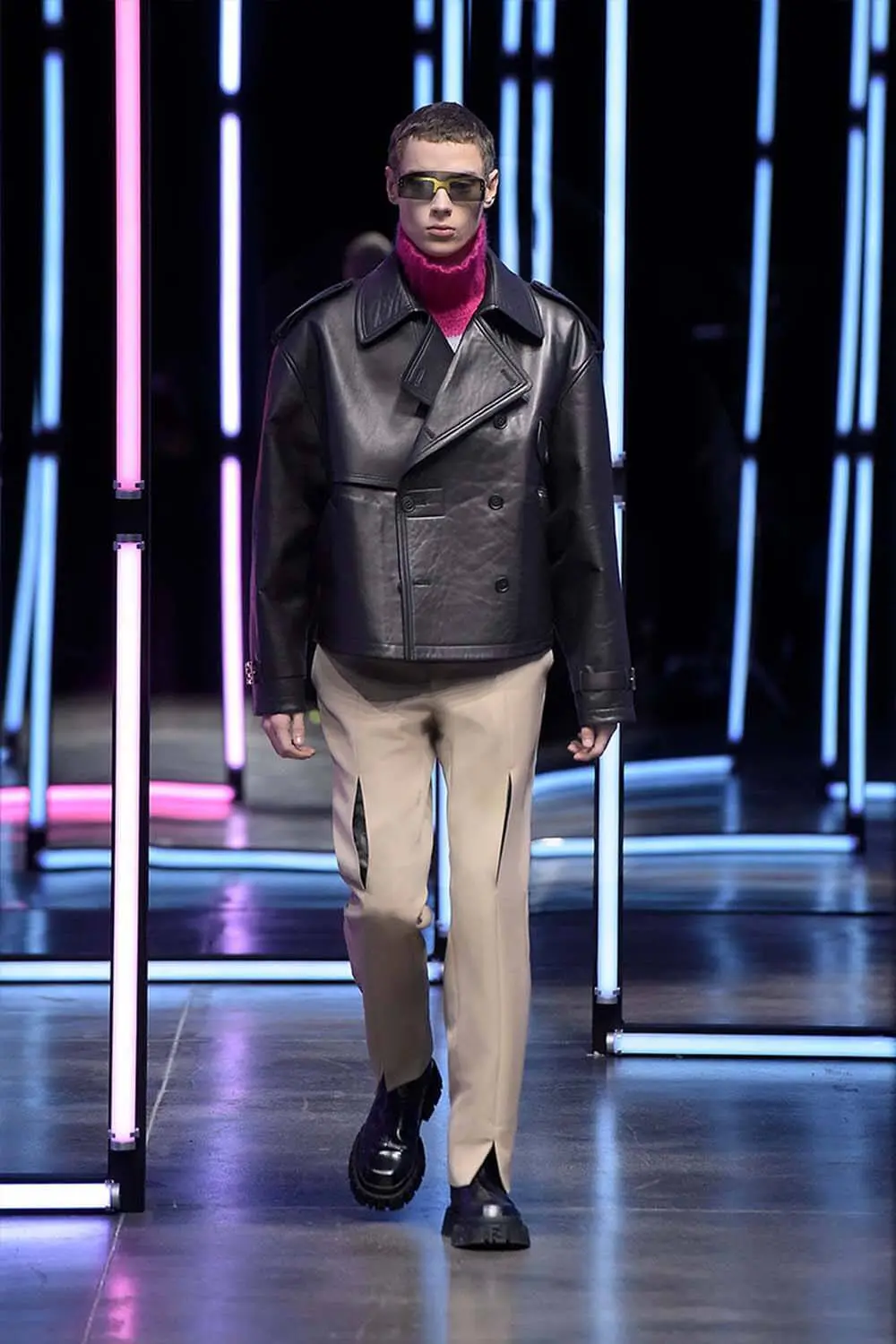 Los tonos crema, carbón y marrón dan paso al zafrán, fucsia, azul cobalto, verde y naranja. Fendi Men FW21 nos desafía con lo que percibimos como «normal» para reinventar las prendas que llevaremos cuando resurjamos del confinamiento. Looks energéticos y optimistas al igual que la banda sonora del artista electrónico italiano Not Waving.