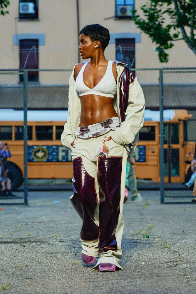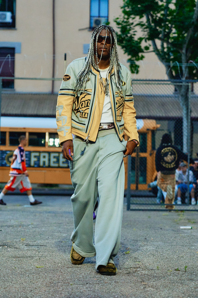 El escenario no fue escogido al azar: un patio carcelario desprovisto de ornamentos, casi brutalista en su crudeza. Allí, en el corazón de ese espacio de contención, la colección tomó forma. La primera imagen: cuerpos encerrados en una jaula metálica, desplazándose como pensamientos atrapados en espiral. Una metáfora tangible del estado mental del diseñador. “A veces siento mi cabeza como una prisión sin salida. La única llave que encuentro es crear”, confesó Formichetti tras el show.