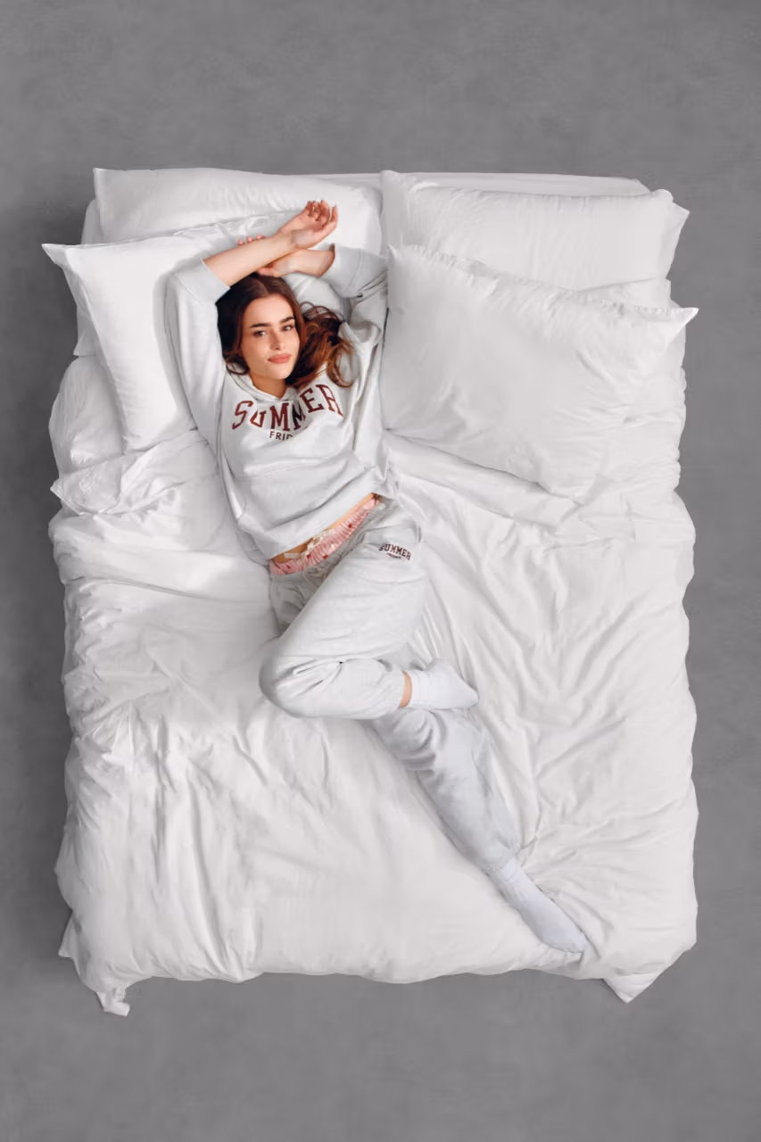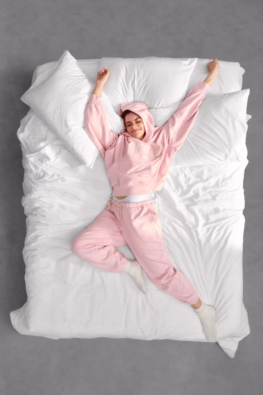En la misma línea, el color es uno de los grandes protagonistas. La colección apuesta por los tonos icónicos de Summer Fridays: «Pink Sugar», «Cherry», «Vanilla» y el azul «Jet Lag Mask». Estos se aplican a sudaderas, hoodies, joggers y pijamas de franela con estampados desenfadados. El toque final lo pone un headband, pensado para acompañar las rutinas de maquillaje y skincare.