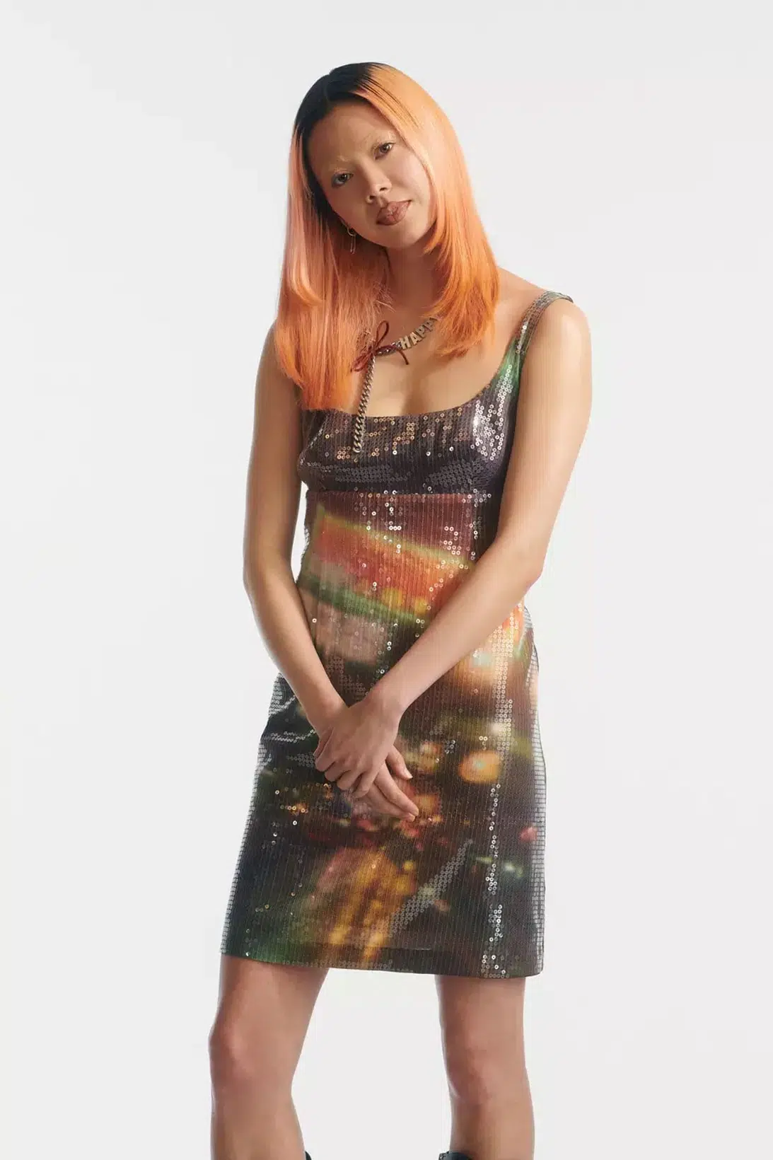Una selección exclusiva de vestidos, tops, faldas y joyas que celebran algunas de las películas más icónicas de Wong como ‘Chungking Express’ o ‘Fallen Angels’. También se rige homenaje a la ciudad de Hong Kong en algunas de las prendas como el vestido de lentejuelas. Por otro lado, aparecen referencias directas a la película ‘Happy Together’ en el colgante de cadena; mientras el cinturón metálico incluye la frase ‘Fallen Angels’.