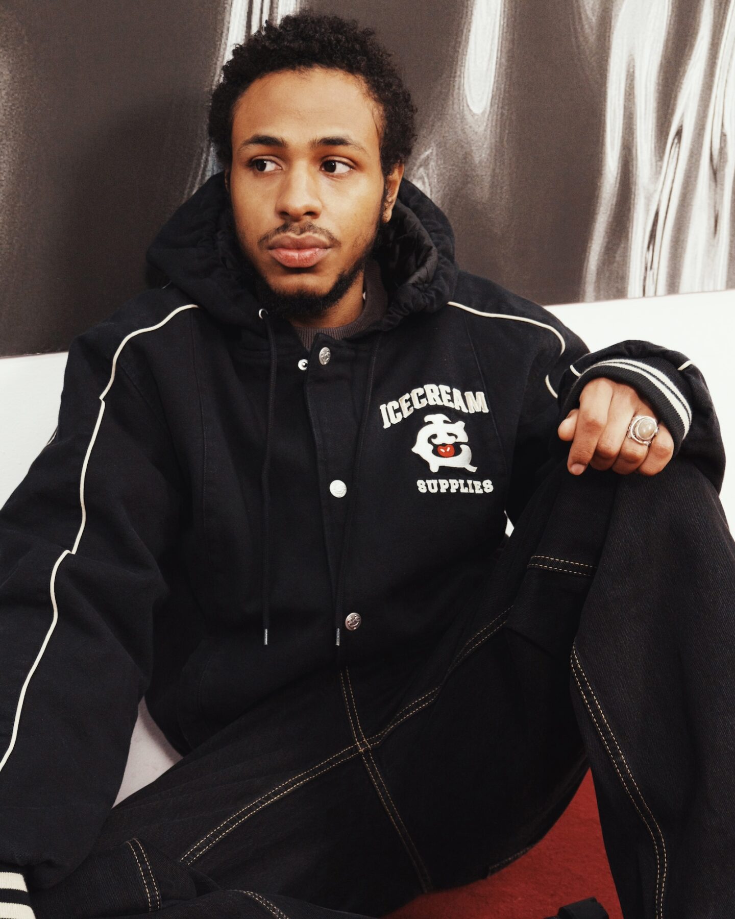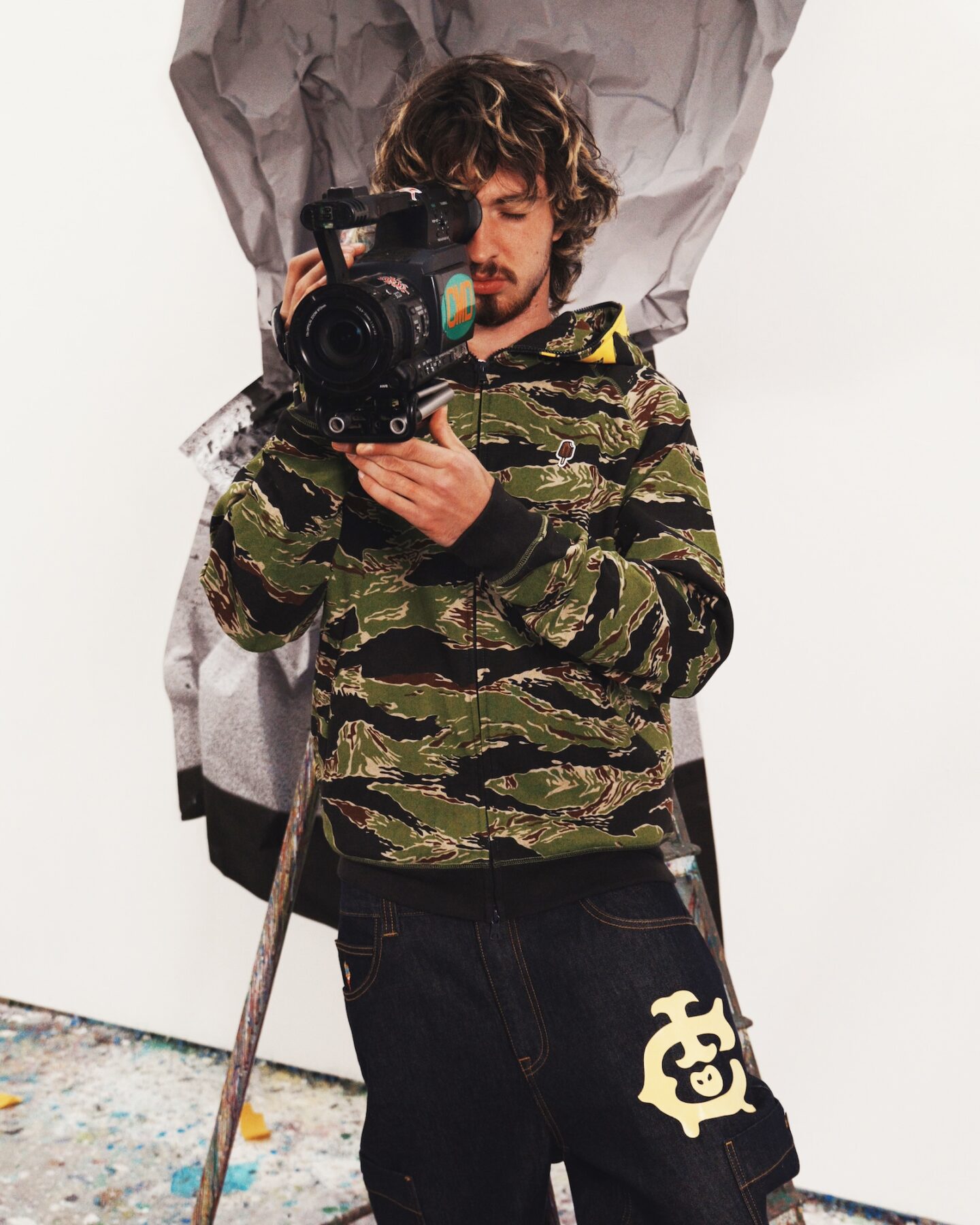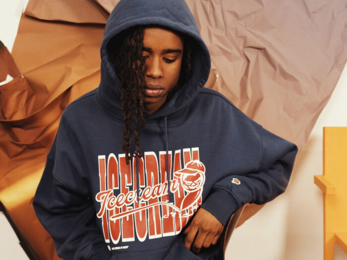 A medio camino entre el workwear, el sportswear y la cultura skate, ICECREAM Pre-Spring 2026 se compone de piezas pensadas para durar y no dejar de moverse. Lonas gruesas, ripstop militar, sudaderas con ribetes de satén y pantalones de chándal con estampados de camuflaje de tigre conviven con el denim tratado y pintado con spray.