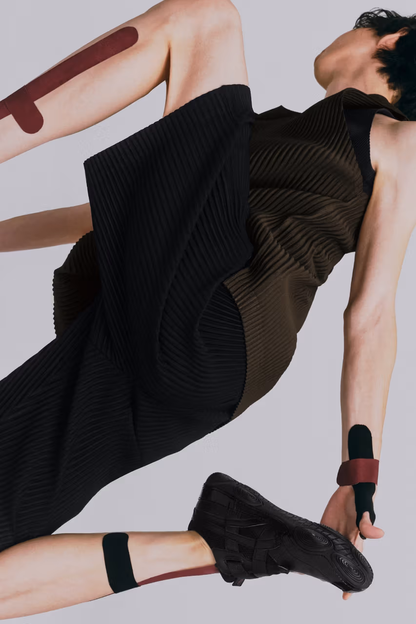 Así, este enfoque busca estabilizar el cuerpo a través de la forma. En esta versión, el taping se convierte en un recurso gráfico potente que envuelve el pie y refuerza el diseño.
