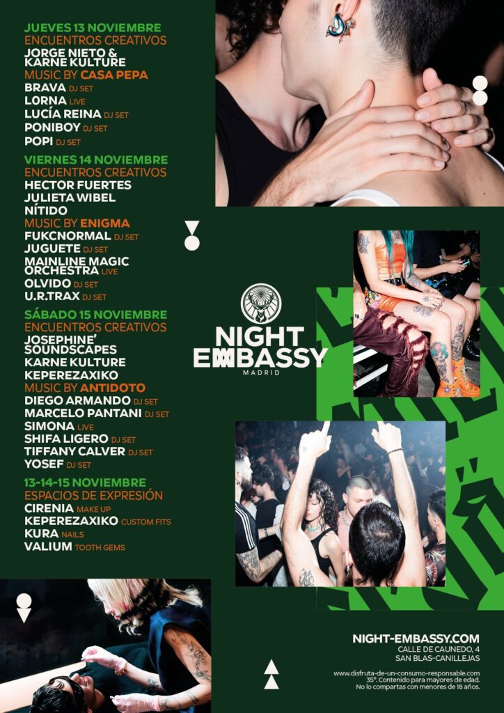Además, en cada sesión, Night Embassy reunirá diferentes formas de expresión individual en estaciones de nail art con Kura, tooth gems con Valium, make-up con Cirenia y personalización de looks con Keperezaxiko.