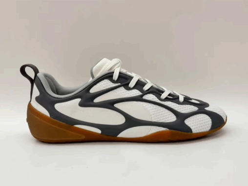 El punto más destacado se encuentra en las capas superiores. Unas estructuras onduladas en relieve, realizadas mediante impresión 3D, recorren el mediopié y el talón. Estos elementos aportan un aspecto escultórico y refuerzan el contraste entre una silueta clásica y un enfoque tecnológico.