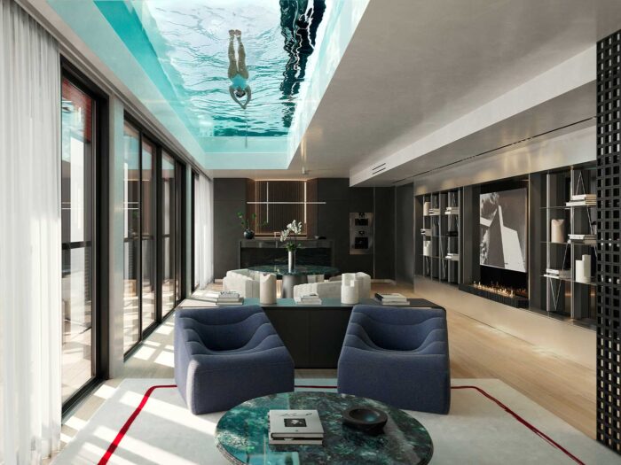 El personal de recepción viste uniformes KARL LAGERFELD hechos a medida con tejidos de la marca. Un toque personal de Karl completa la planta de bienestar: un sistema de sonido subacuático en la piscina, inspirado en los que se instalaron en la propia casa de Karl Lagerfeld en Biarritz. La piscina privada exterior de la penthouse está diseñada con un suelo transparente que forma el techo de la planta inferior, lo que añade una capa única y atrevida al espacio interior. Cada apartamento incluye un jacuzzi privado.