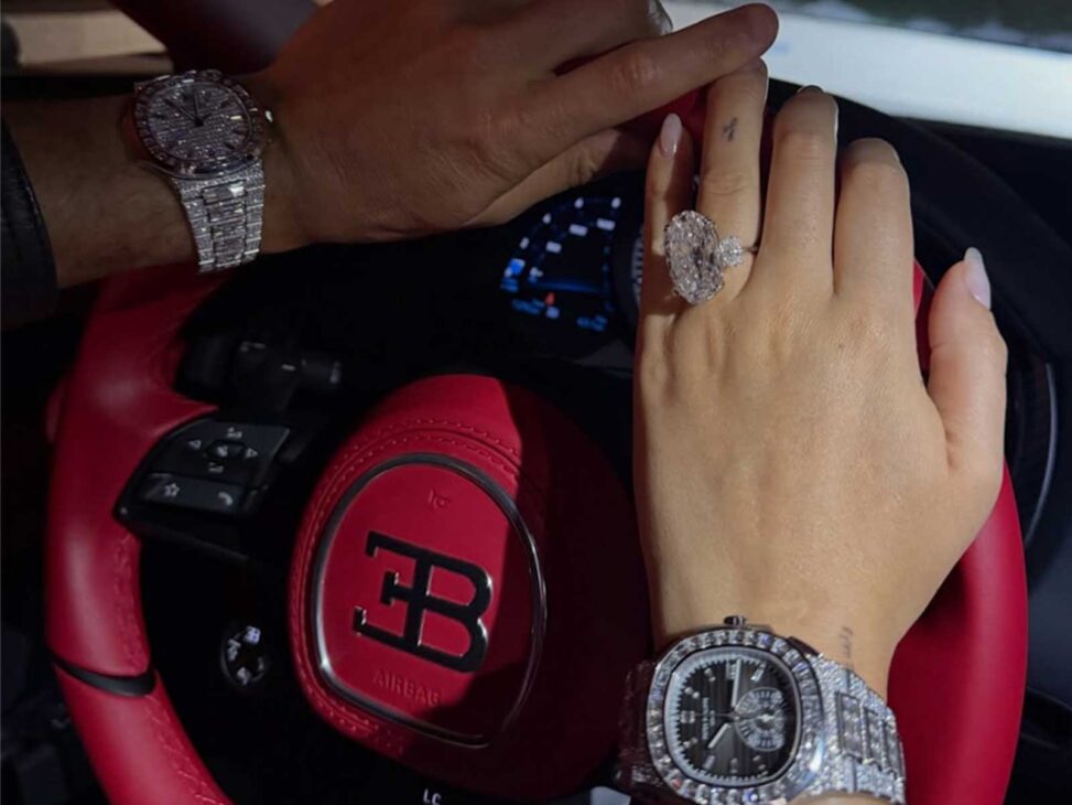 Lo primero en lo que nos fijamos es en las muñecas de ambos: una sincronía perfectamente calculada con dos piezas de Patek Philippe. Gio opta por un Nautilus Chronograph Joaillerie (Ref. 5980/1400G-010), una pieza valorada aproximadamente en 788.066 dólares al estar completamente engastado con 191 diamantes. Cristiano tampoco se queda corto, luciendo un Nautilus (Ref. 5811/1460G-001) cuyo precio podría ascender a los 721.986 dólares debido a los 1.285 diamantes que incluye.