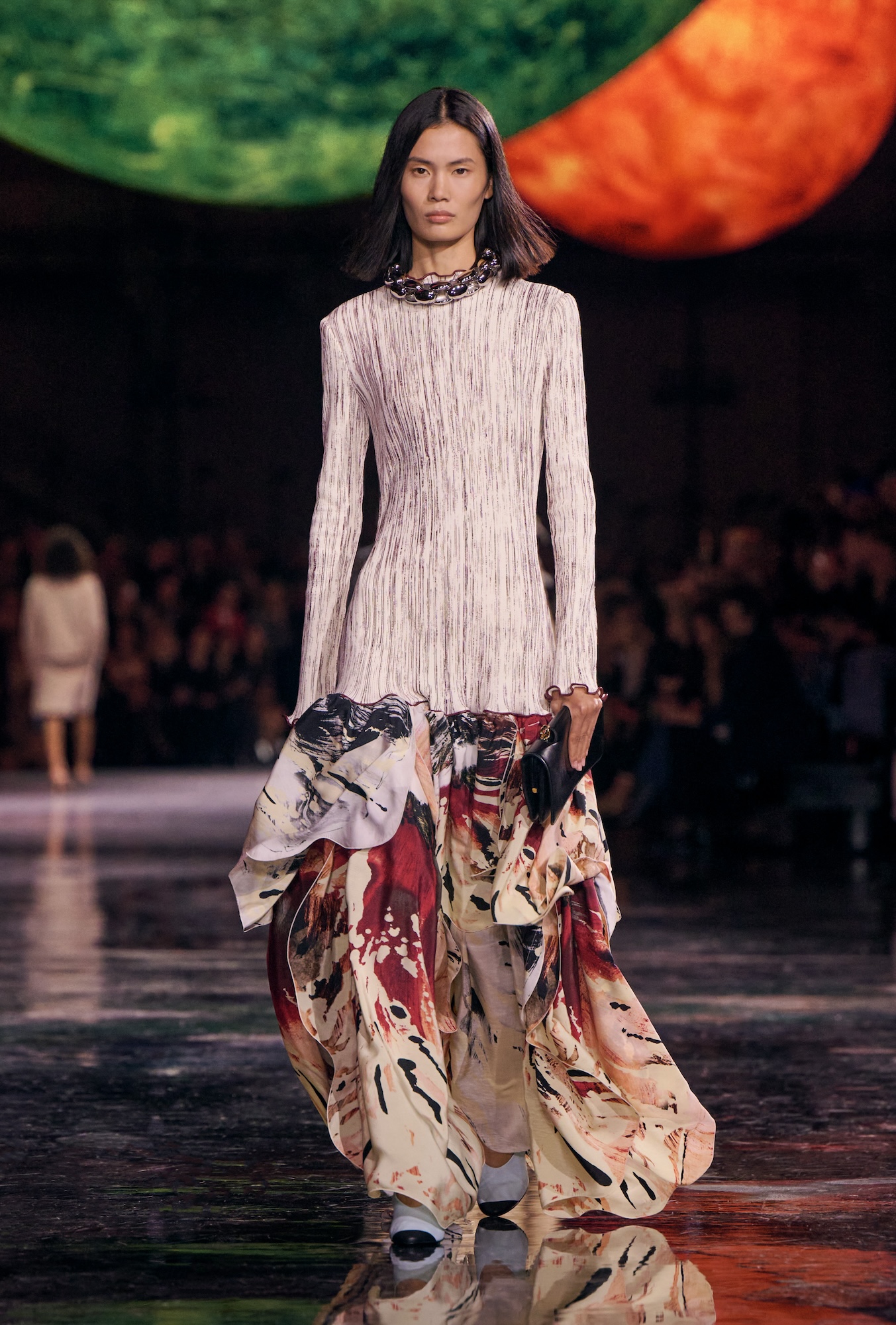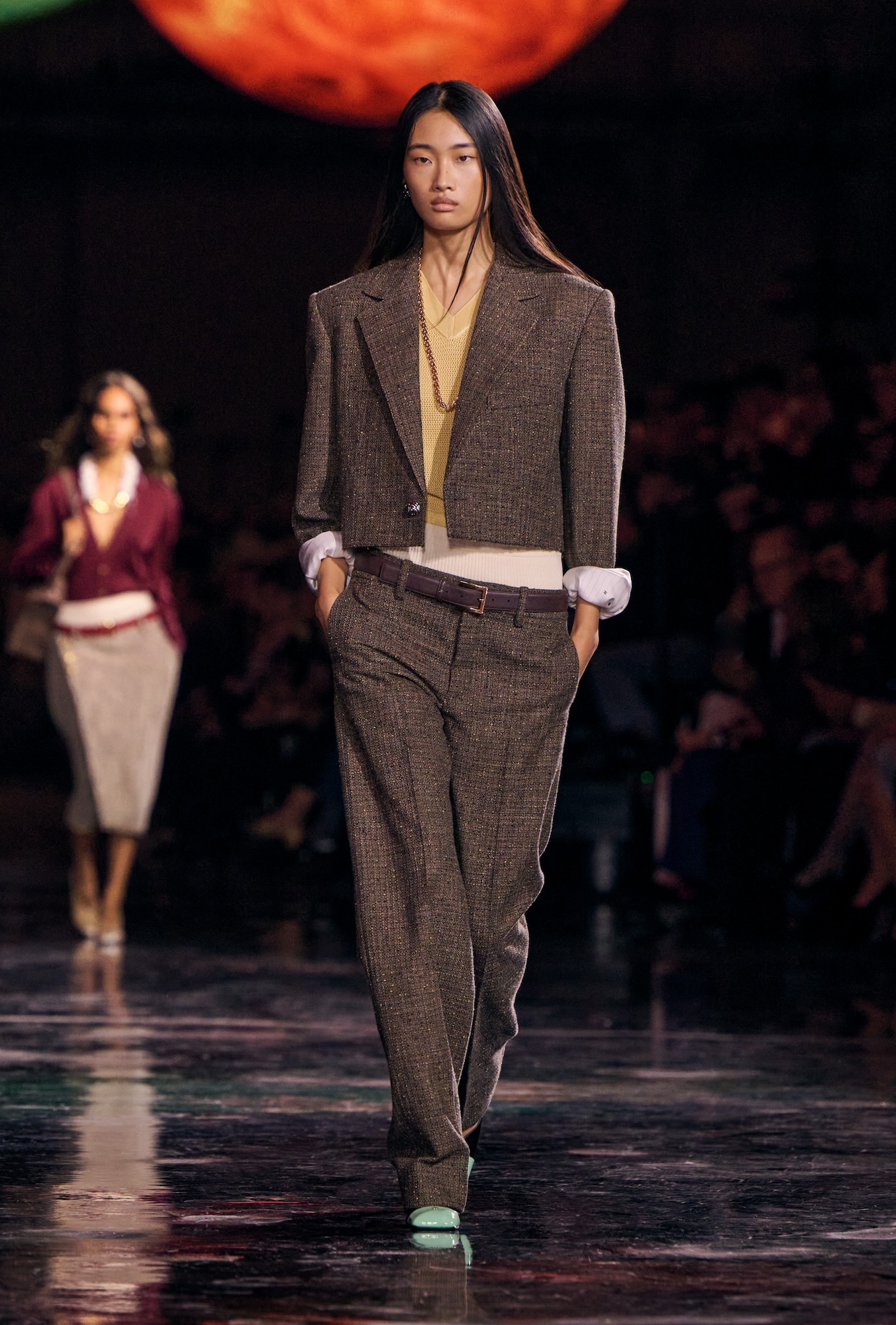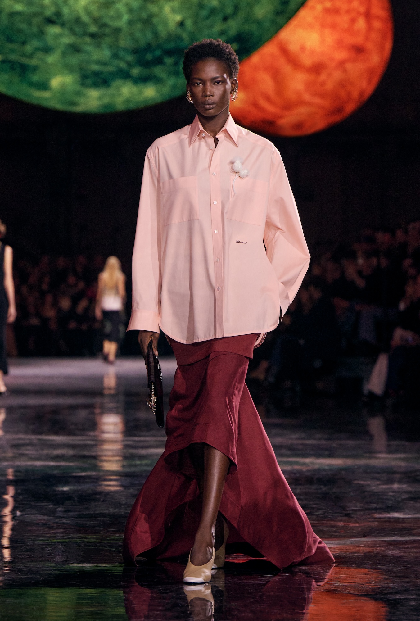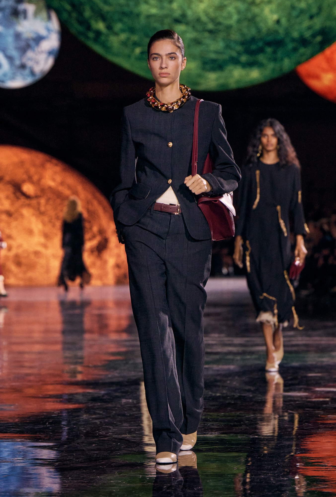 Entre planetas de colores vibrantes y una banda sonora emocionante, la colección Primavera-Verano 2026 abrió una paradoja: lo masculino como punto de partida de lo femenino. Una camisa y un pantalón -la herencia de Boy Capel– se transforman en símbolos de poder y deseo. La camisa, confeccionada junto a Charvet, mantiene su rigidez clásica, pero se suaviza al contacto con el cuerpo femenino. Las chaquetas, inspiradas en los trajes británicos, revelan bordes sin rematar y proporciones sutilmente subvertidas.