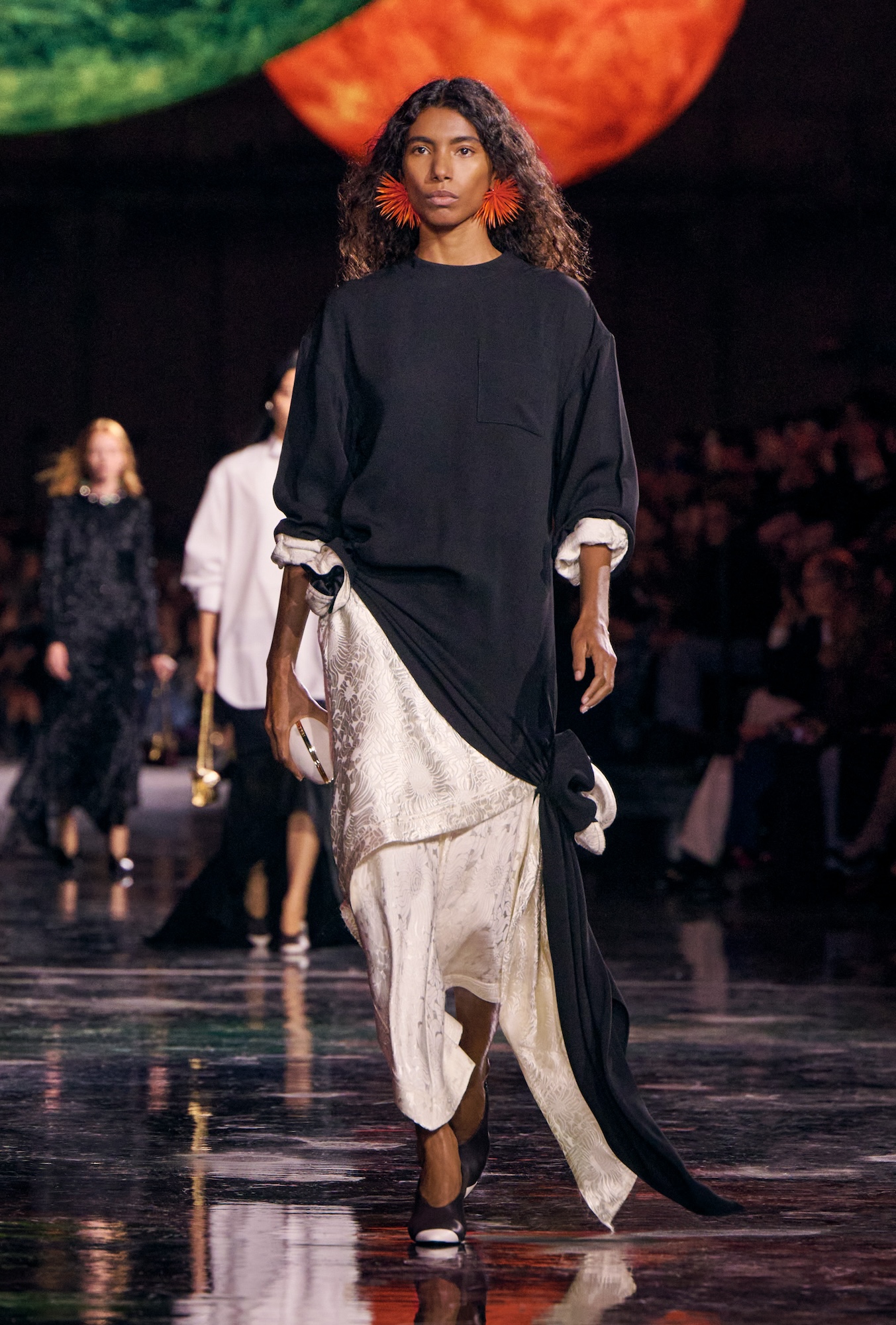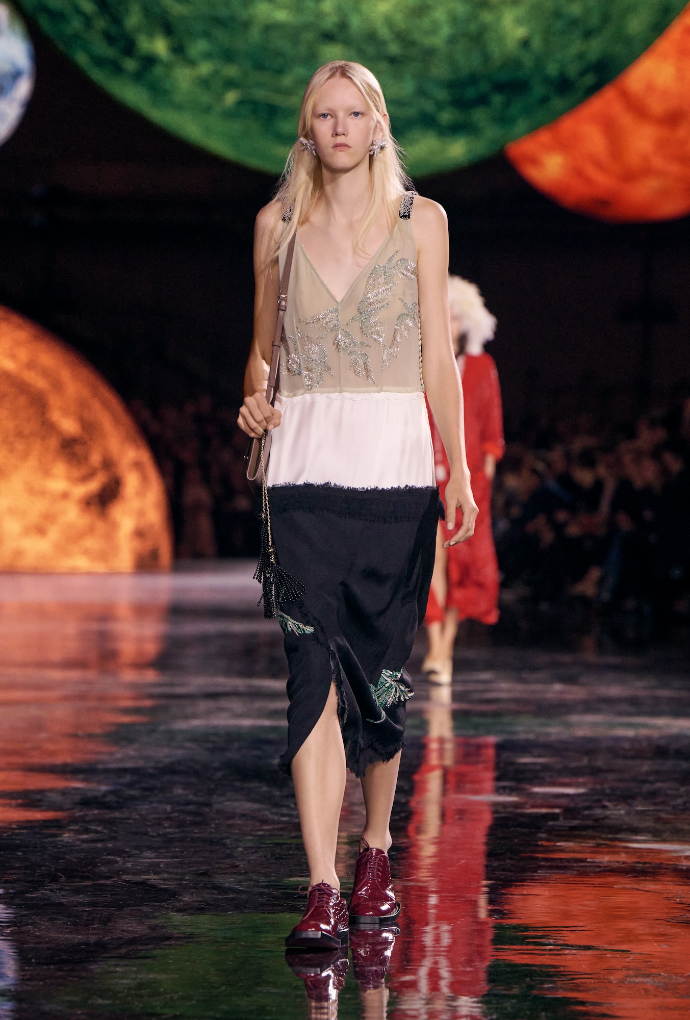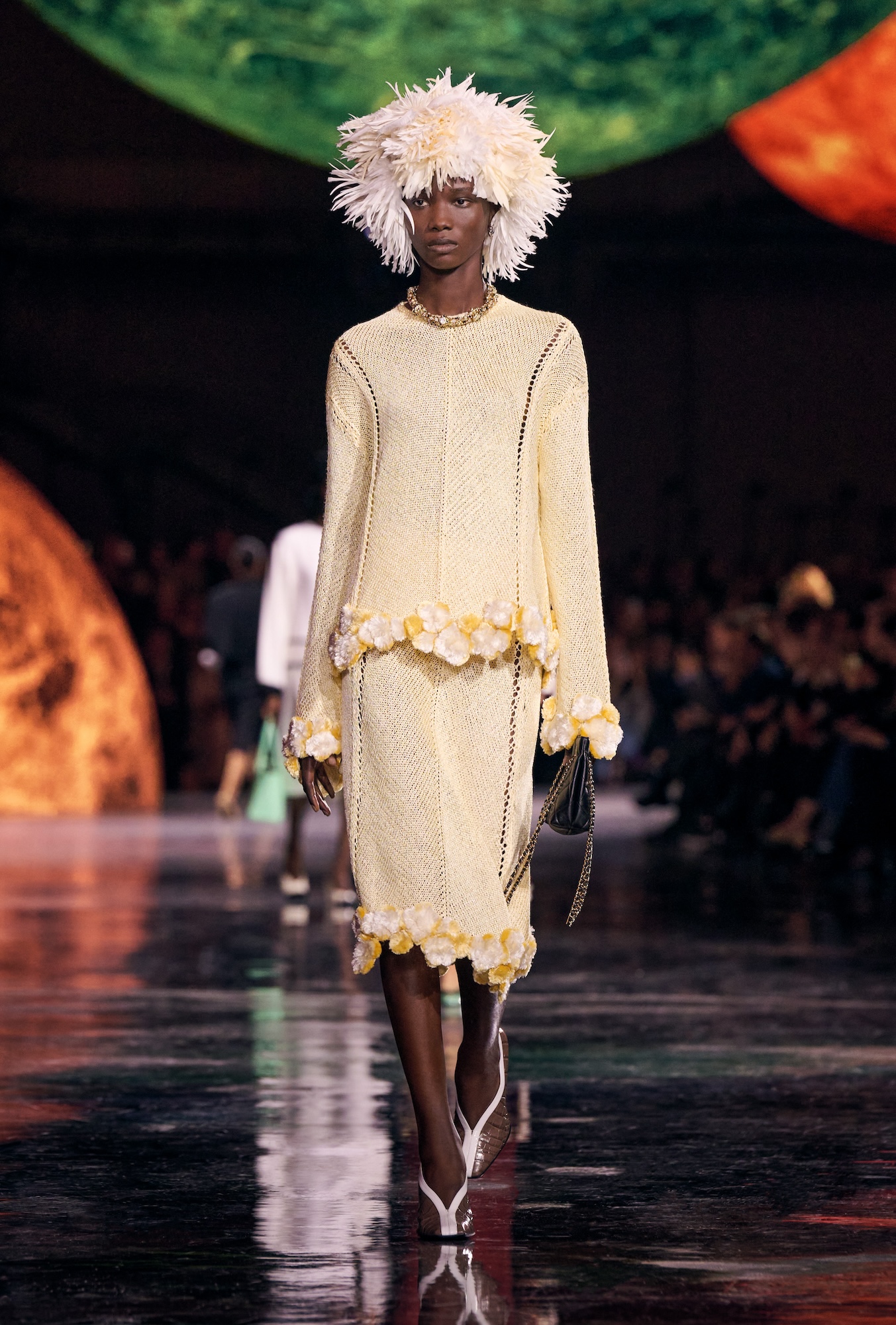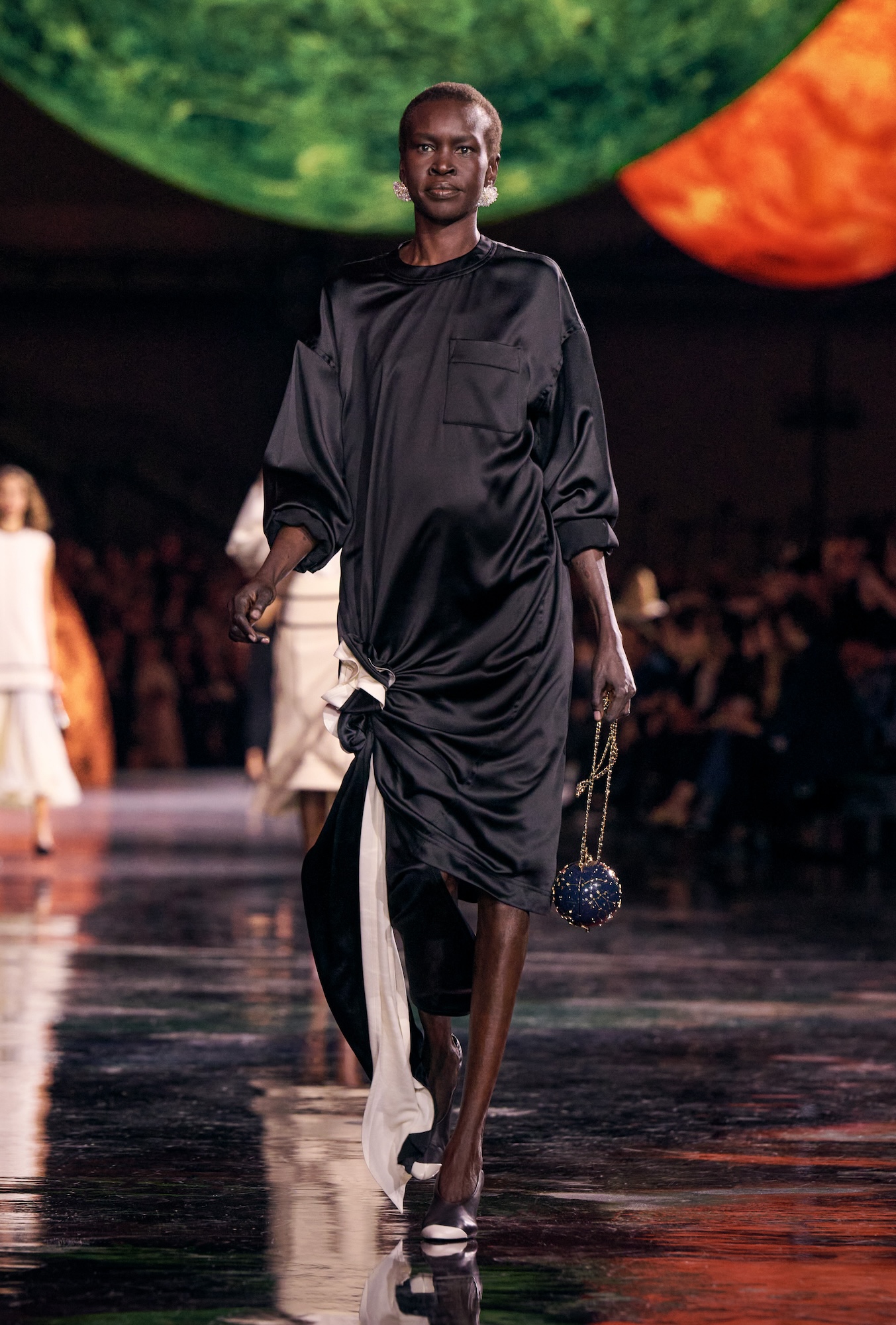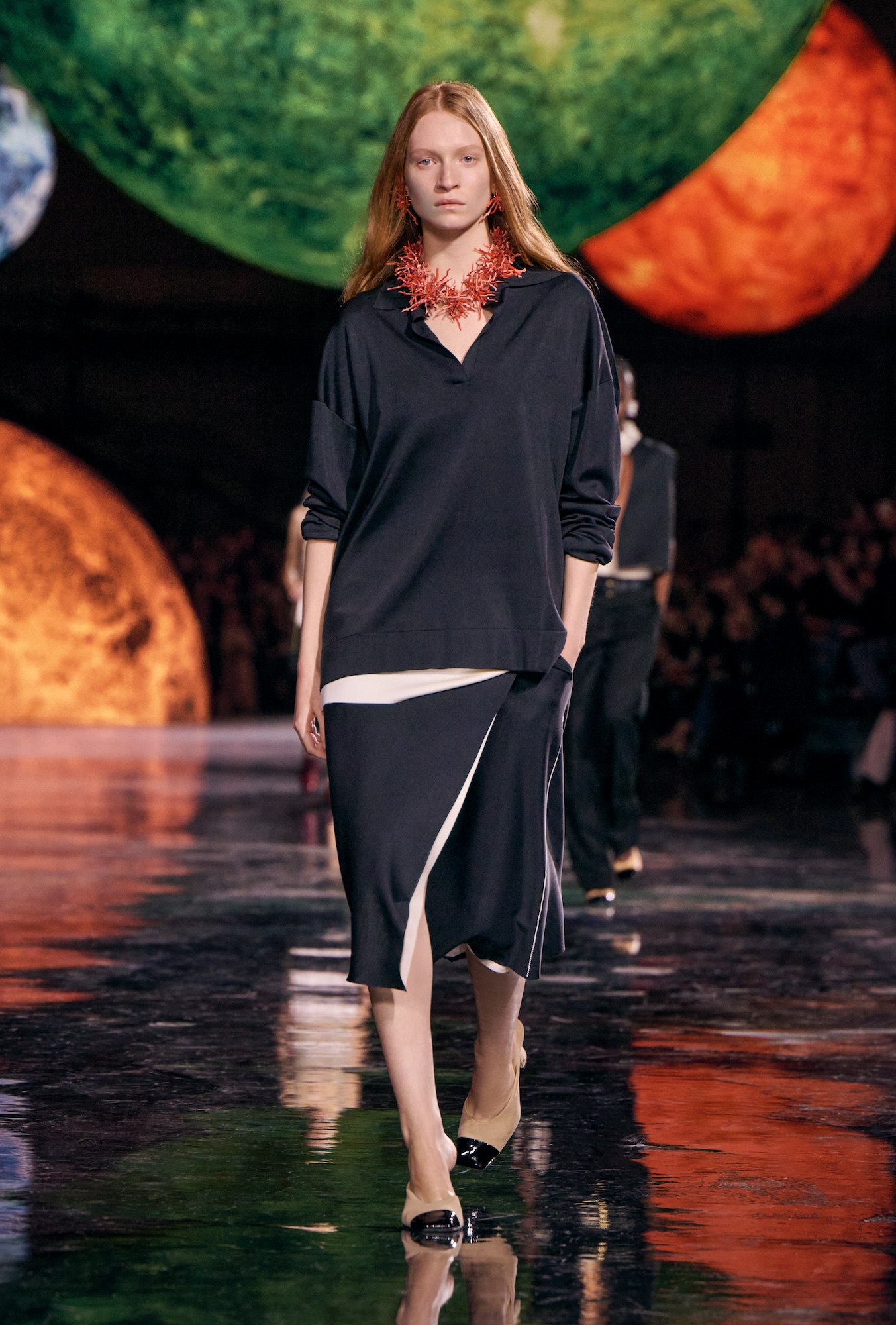 Entre planetas de colores vibrantes y una banda sonora emocionante, la colección Primavera-Verano 2026 abrió una paradoja: lo masculino como punto de partida de lo femenino. Una camisa y un pantalón -la herencia de Boy Capel– se transforman en símbolos de poder y deseo. La camisa, confeccionada junto a Charvet, mantiene su rigidez clásica, pero se suaviza al contacto con el cuerpo femenino. Las chaquetas, inspiradas en los trajes británicos, revelan bordes sin rematar y proporciones sutilmente subvertidas.