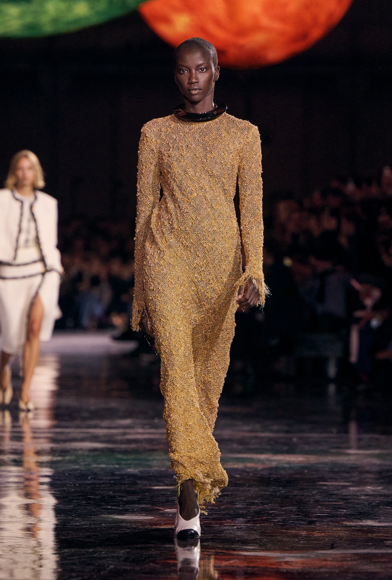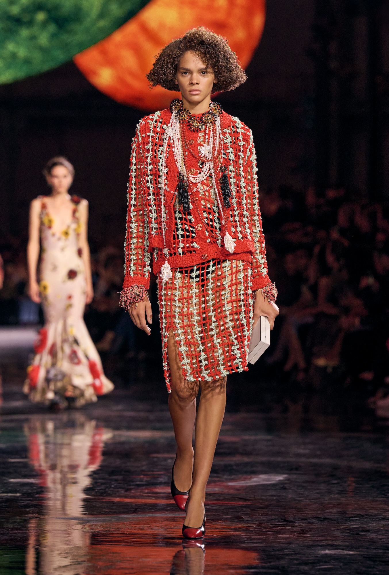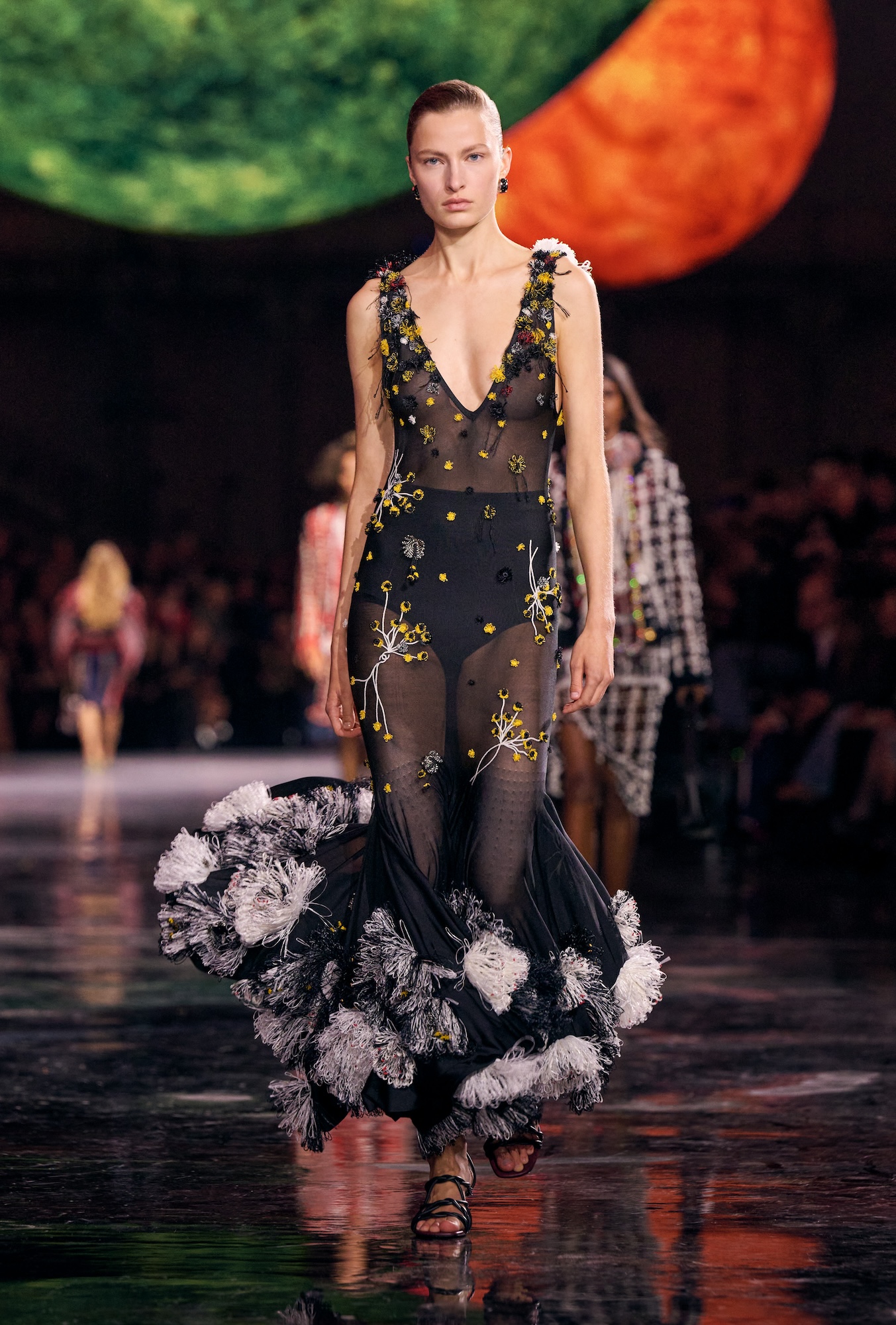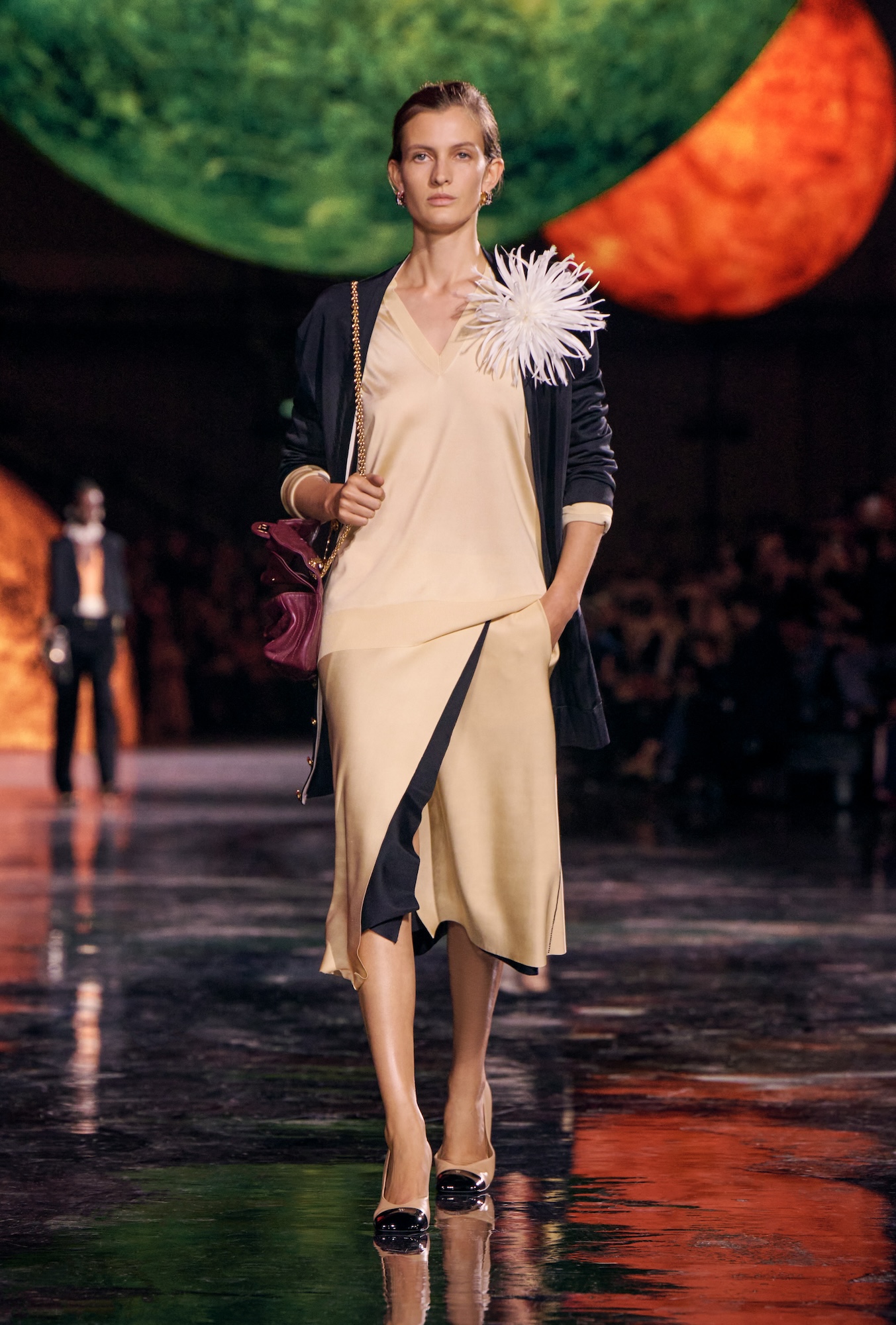 Los códigos gráficos de Chanel -el blanco y el negro, las líneas Art Déco, la arquitectura- se reconfiguran sobre sedas fluidas, bordados delicados y estampados que se expanden como pétalos. Las líneas se suavizan y se redondean, las transparencias cobran protagonismo, y las joyas orbitan como planetas de cristal, con perlas deformadas.