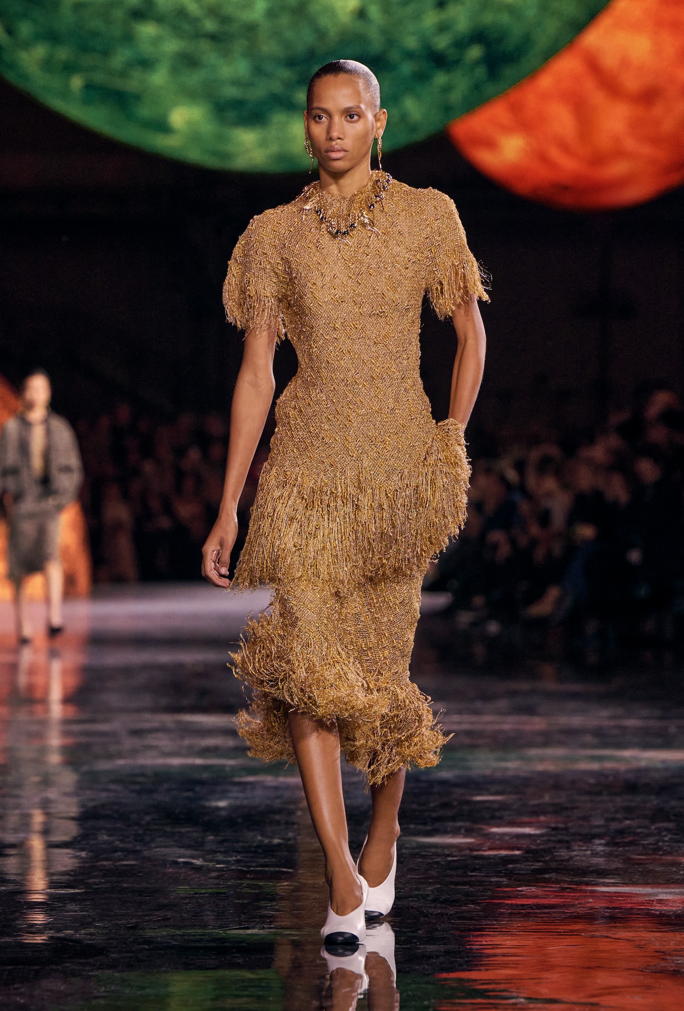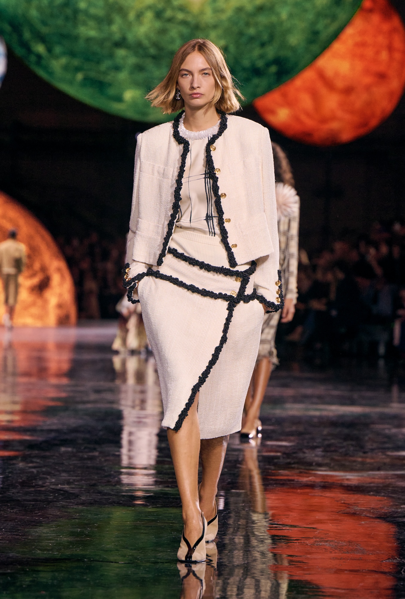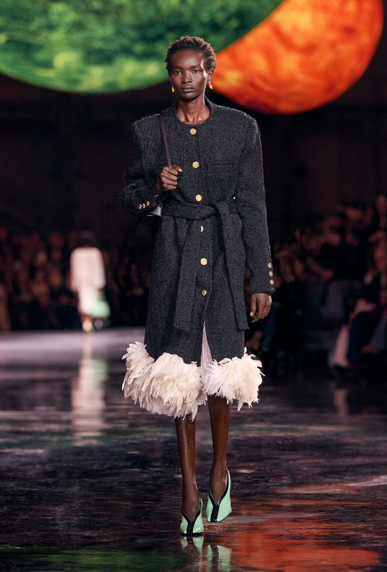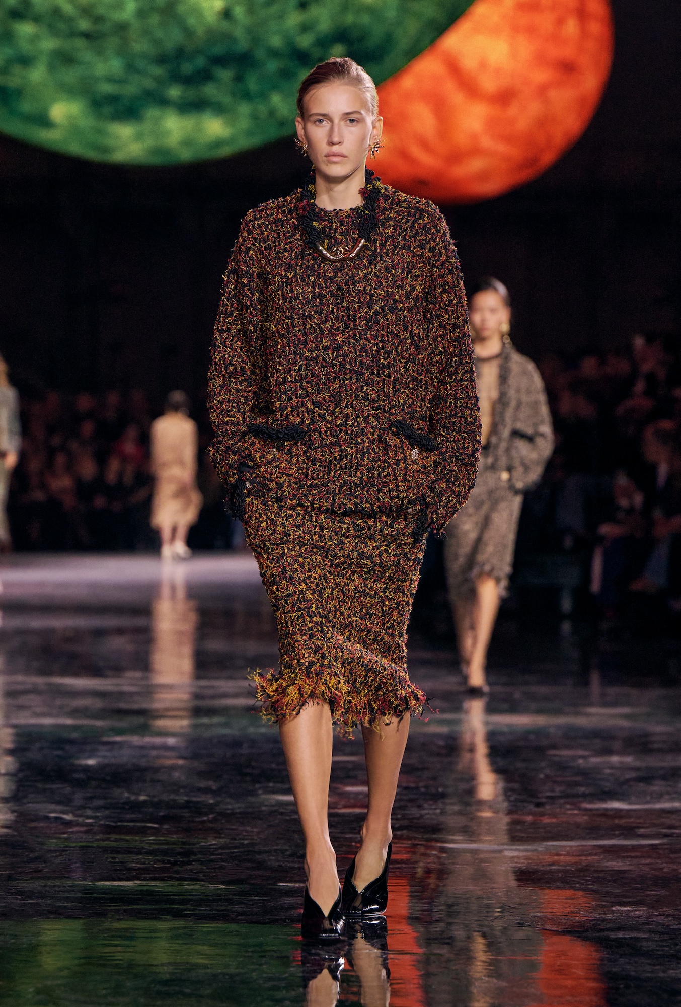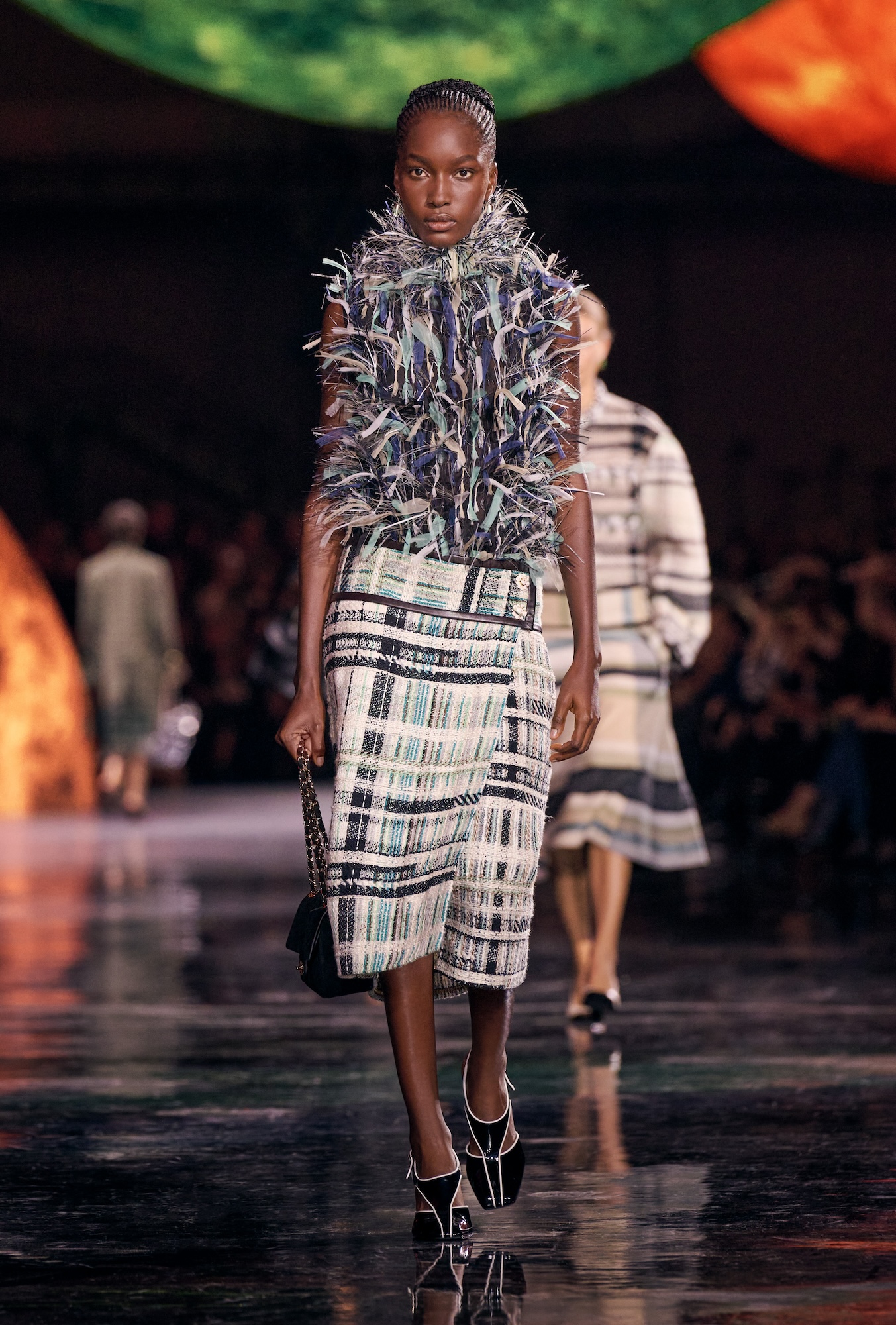 El tweed inconfundible de Chanel, el mismo que nunca deja de mutar, aparece ahora pulido, ágil, con una determinación que evoca movimiento. Blazy juega con la dualidad entre lo pragmático y lo seductor, con el objetivo de conquistar al mundo y también dejarse conquistar al mismo tiempo.