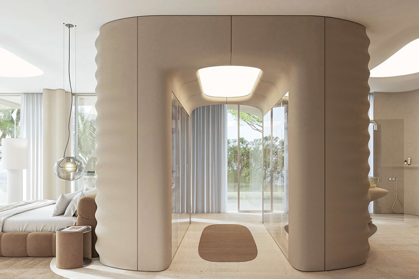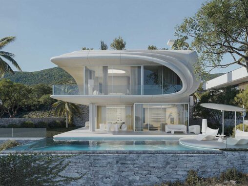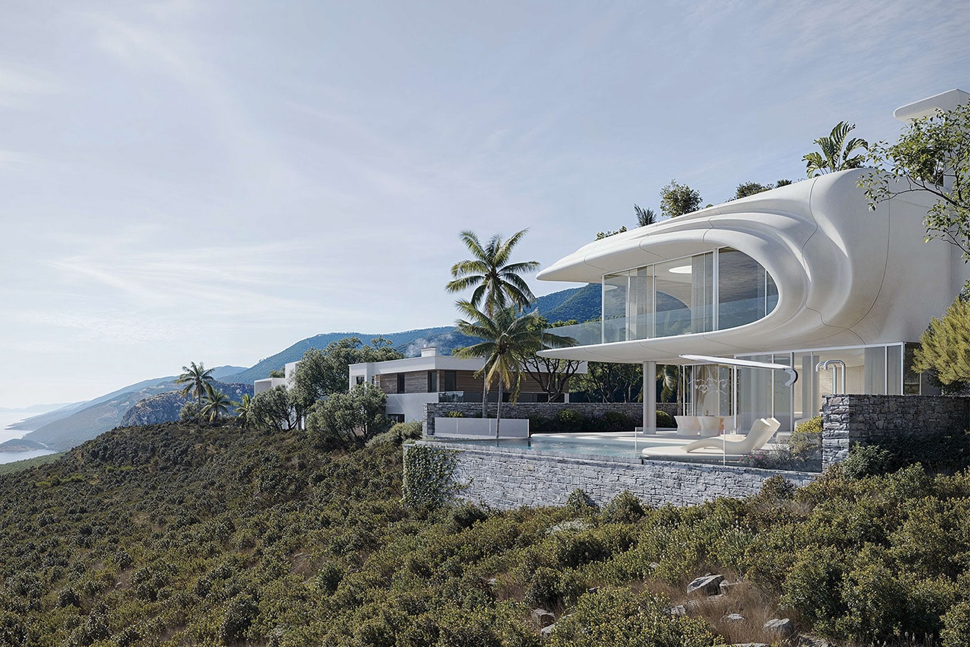 Lejos de las formas rectilíneas que suelen dominar el lujo mediterráneo, Stipfold opta esta vez por una geometría orgánica, donde los techos y las paredes se funden en una única concha blanca continua, simulando el movimiento del agua detenida en el tiempo.