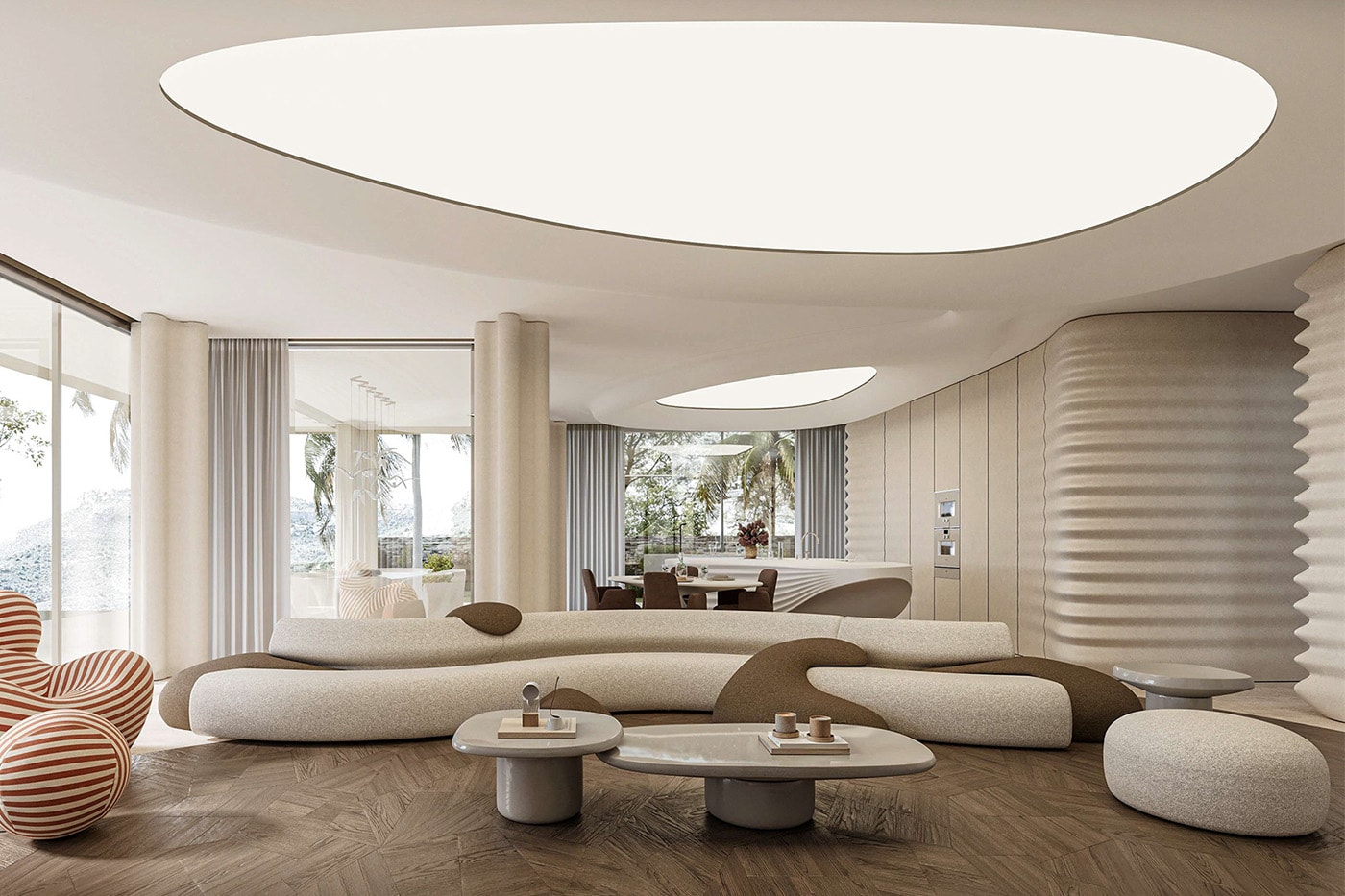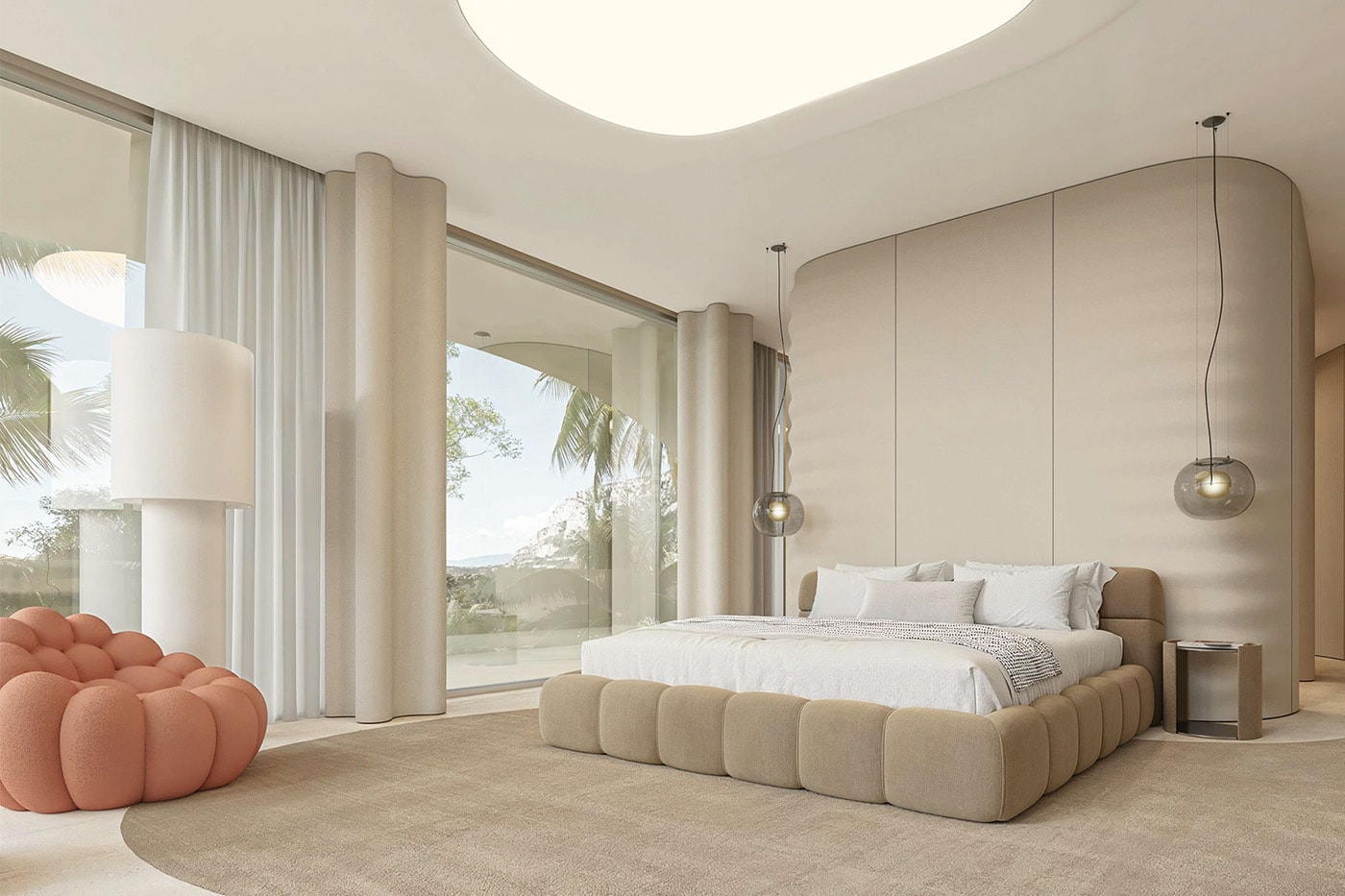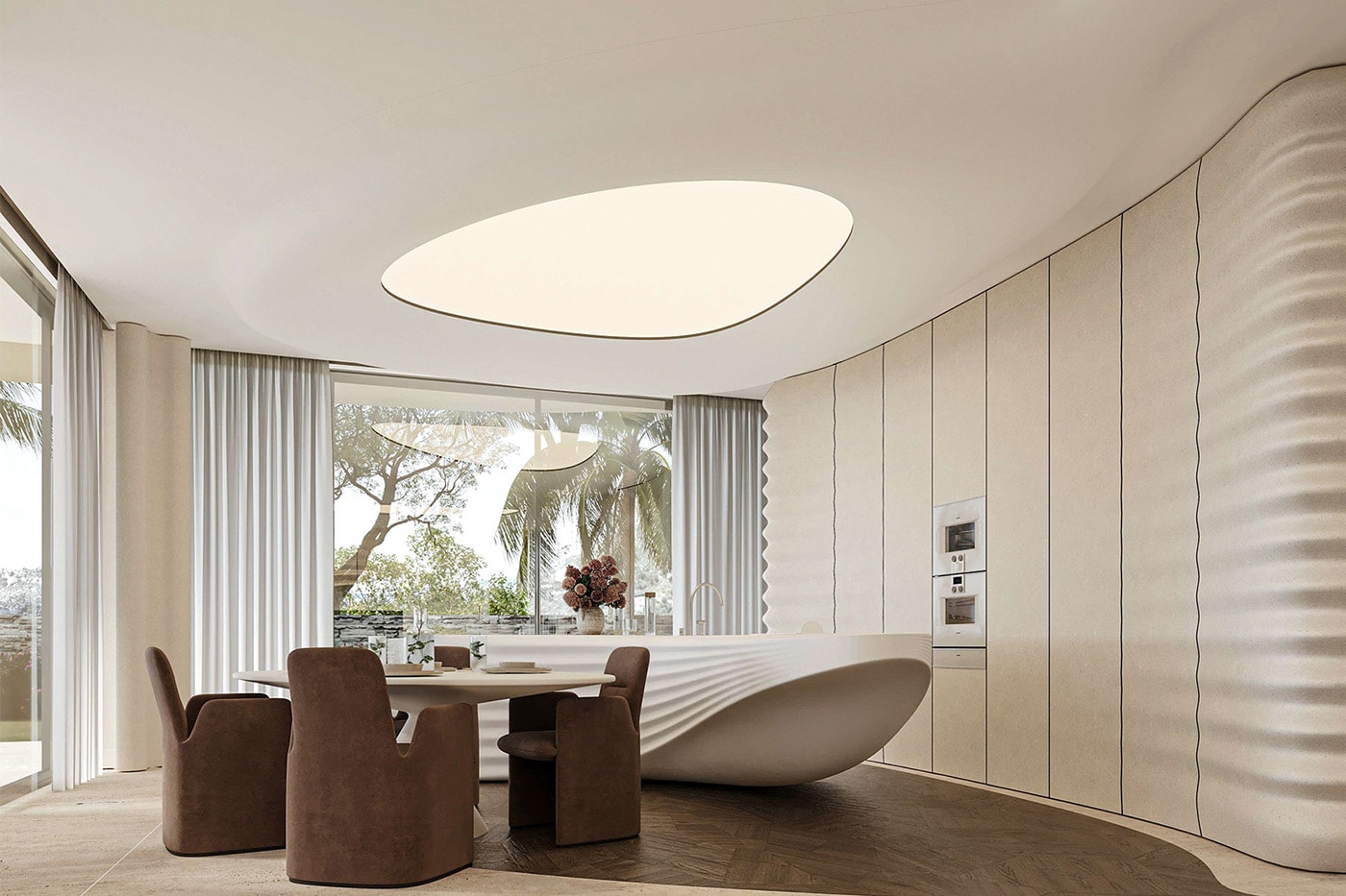 En su interior, la filosofía de la fluidez continúa en cada detalle. El salón principal, con su doble altura, enfatiza la escala y la curvatura de la estructura, creando una sensación de ligereza espacial que nunca sacrifica la conexión visual con el paisaje. Los materiales y acabados siguen un espectro cromático minimalista -blancos, arenas y maderas pálidas- que permite a la arquitectura escultural ser la verdadera protagonista.