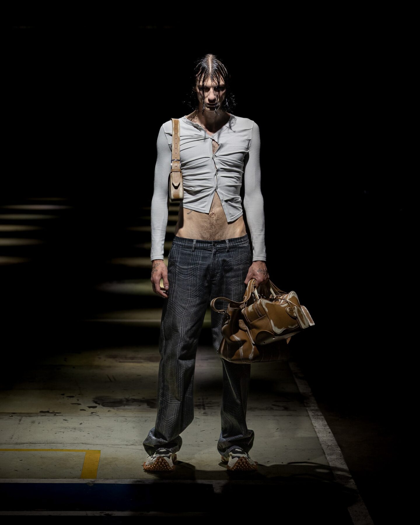 Lo que parecía una estructura olvidada se transformó en un espacio que jugaba con la percepción y la identidad: una representación del tránsito, la transformación y el escape. Entre columnas de cemento y luces espectrales, los diferentes personajes protagonistas se fueron sucediendo, como si acabasen de salir de una rave post-industrial, maquillados por Inge Grognard y peinados por Louis Ghewy.