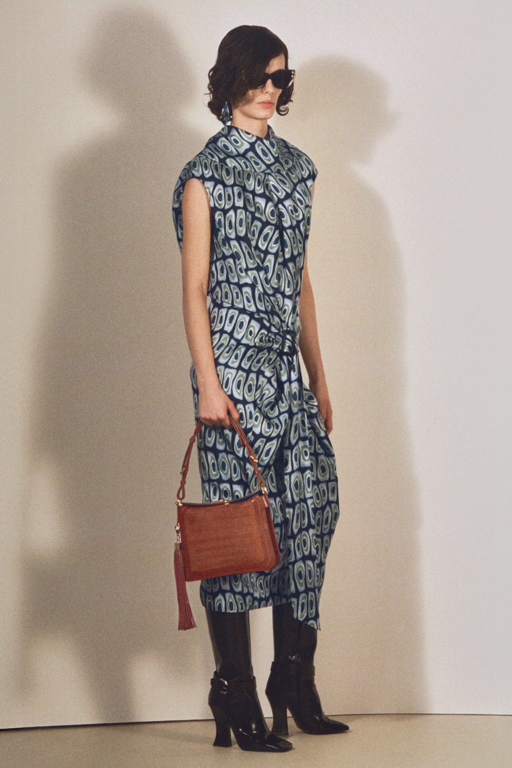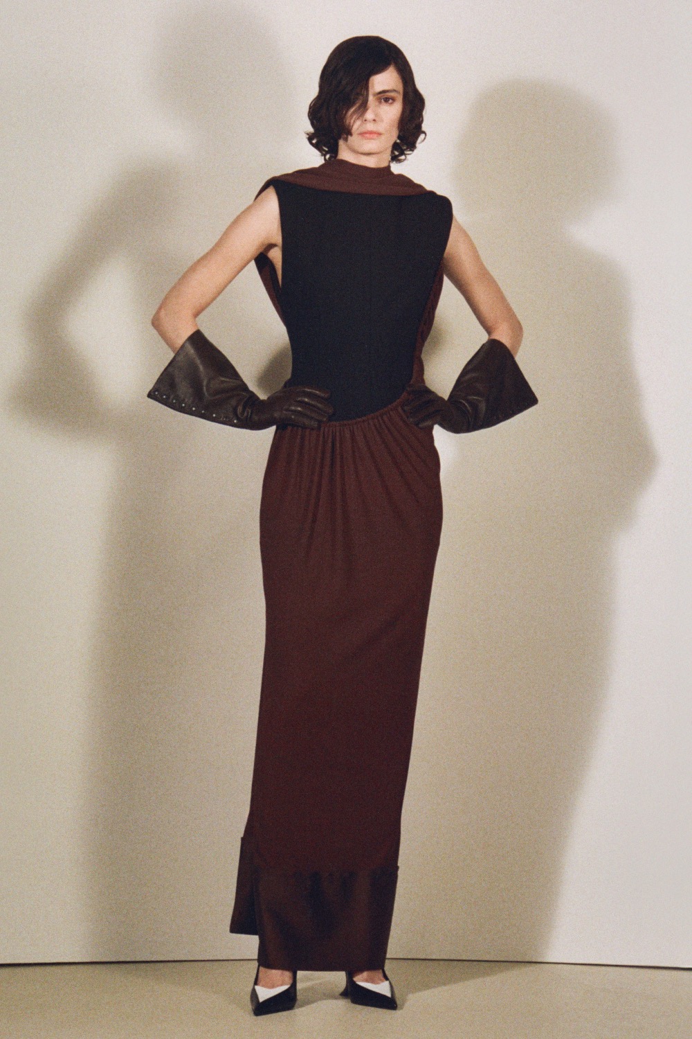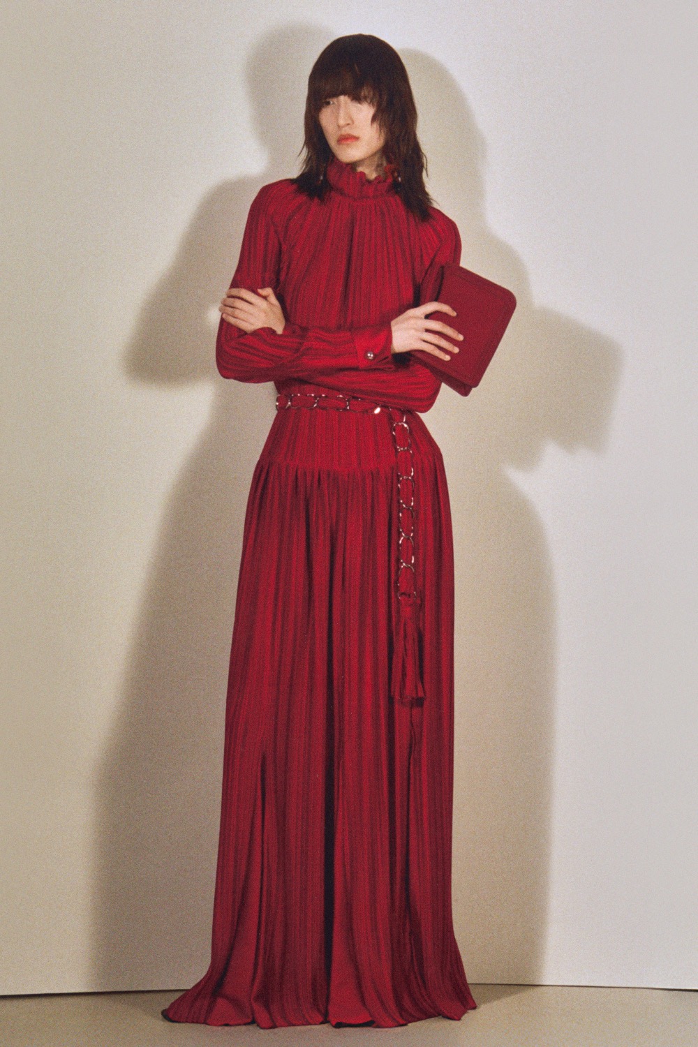 Las prendas deslizan entre lo clásico de la Maison y una protección casi escultórica. Cuellos que suben como estructuras arquitectónicas, cashmere compacto, faldas manta, abrigos que envuelven el cuerpo como si fueran una armadura del siglo XXI. De noche, las piezas brillan sin barroquismo: embellecidos termosellados que reinterpretan el bordado sin convertirlo en reliquia. Los prints inspirados en Murano aparecen en tops y vestidos segunda piel, como un eco del viaje original. La paleta va de grises suaves a rojos venecianos intensos, con apariciones discretas del nuevo Lanvin Blue escondidas en forros y plantillas.