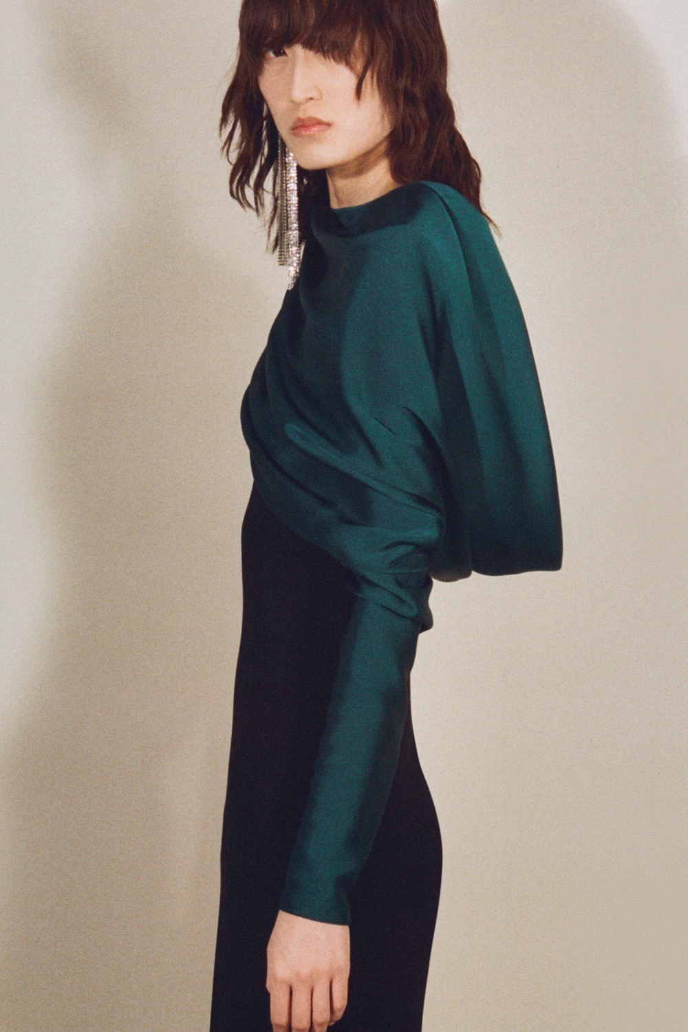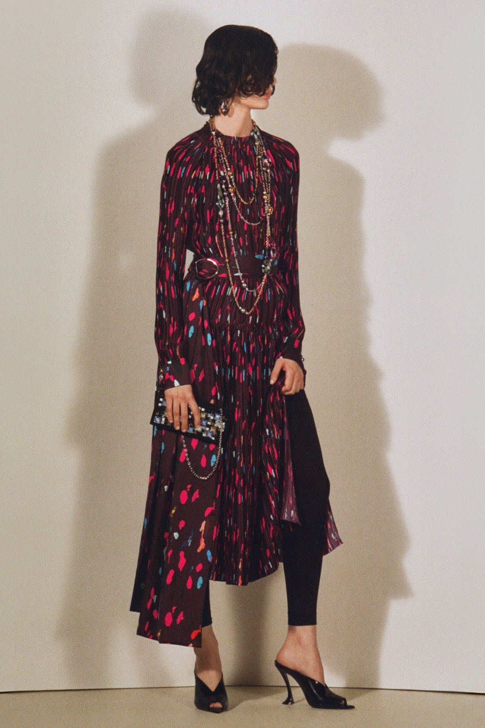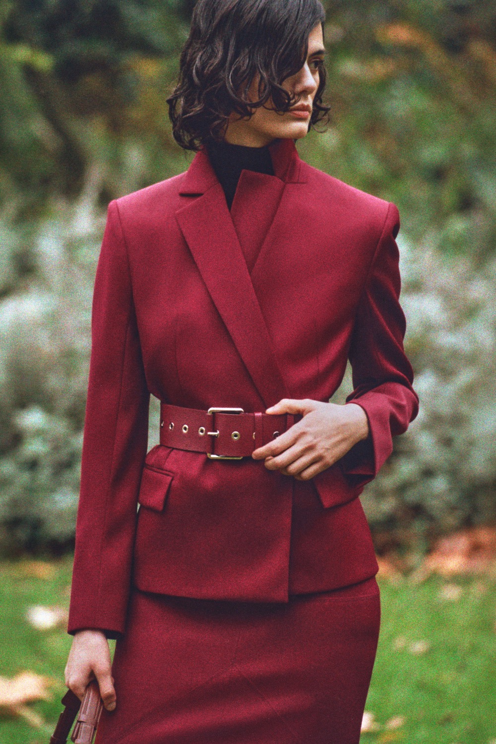Las prendas deslizan entre lo clásico de la Maison y una protección casi escultórica. Cuellos que suben como estructuras arquitectónicas, cashmere compacto, faldas manta, abrigos que envuelven el cuerpo como si fueran una armadura del siglo XXI. De noche, las piezas brillan sin barroquismo: embellecidos termosellados que reinterpretan el bordado sin convertirlo en reliquia. Los prints inspirados en Murano aparecen en tops y vestidos segunda piel, como un eco del viaje original. La paleta va de grises suaves a rojos venecianos intensos, con apariciones discretas del nuevo Lanvin Blue escondidas en forros y plantillas.