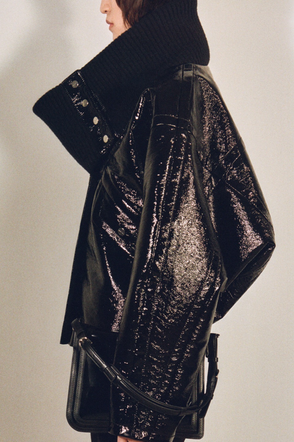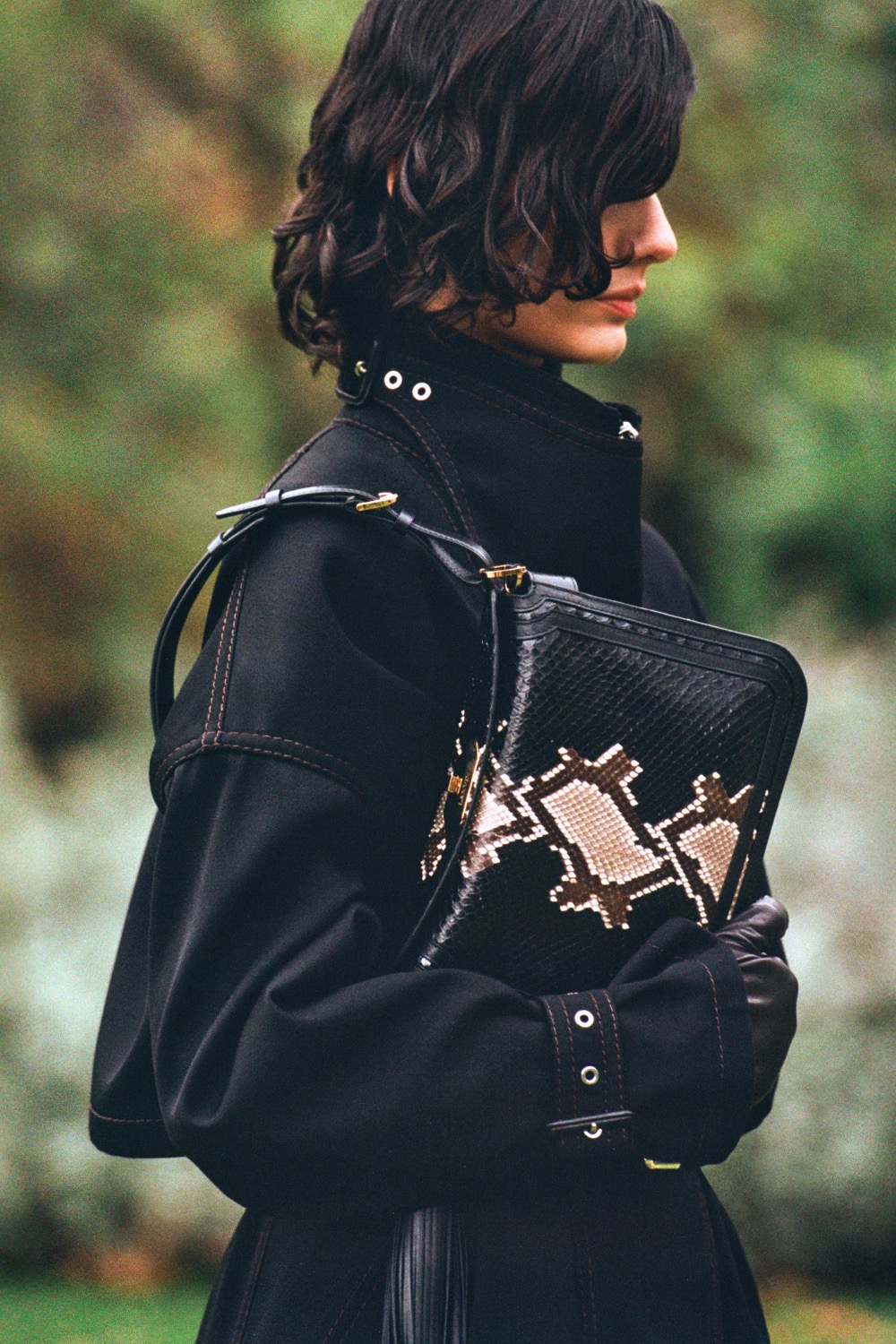 Los accesorios mantienen el mismo tono. El Compagnon vuelve renovado, ahora en tres tamaños y materiales que van desde cuero lacado hasta croc emboss. El Midnight Step se reinventa en versión de día, con un tacón de madera que conserva la actitud pero cambia el contexto.