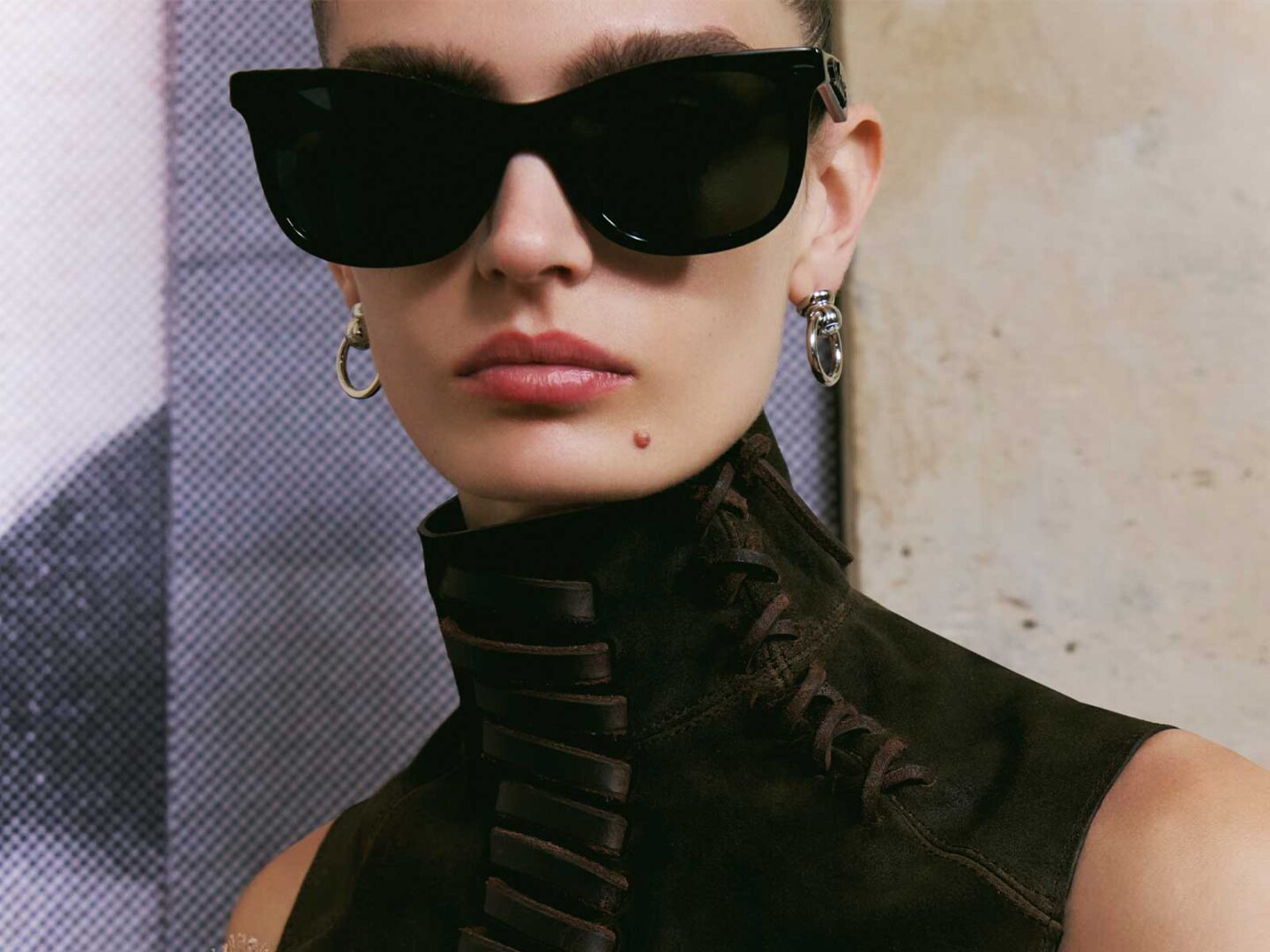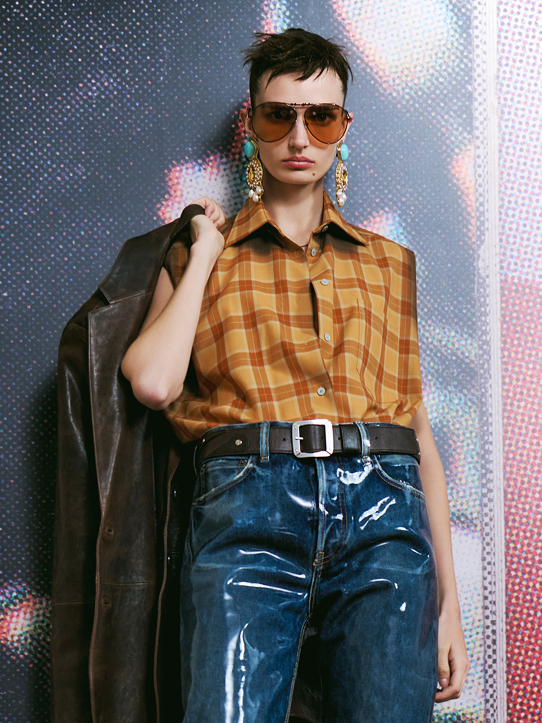Entre los diseños clave destaca una montura metálica que revista las icónicas gafas de aviador de los años 70. Esta opción, que apareció inicialmente en el catálogo de moda masculina antes de dar el salto a la pasarela femenina, se presenta ahora como un diseño ligero pero con presencia. La combinación de lentes de nailon y una estructura estilizada da lugar a una silueta versátil disponible en negro, marrón con lentes naranjas y una versión en plata con lentes transparentes.