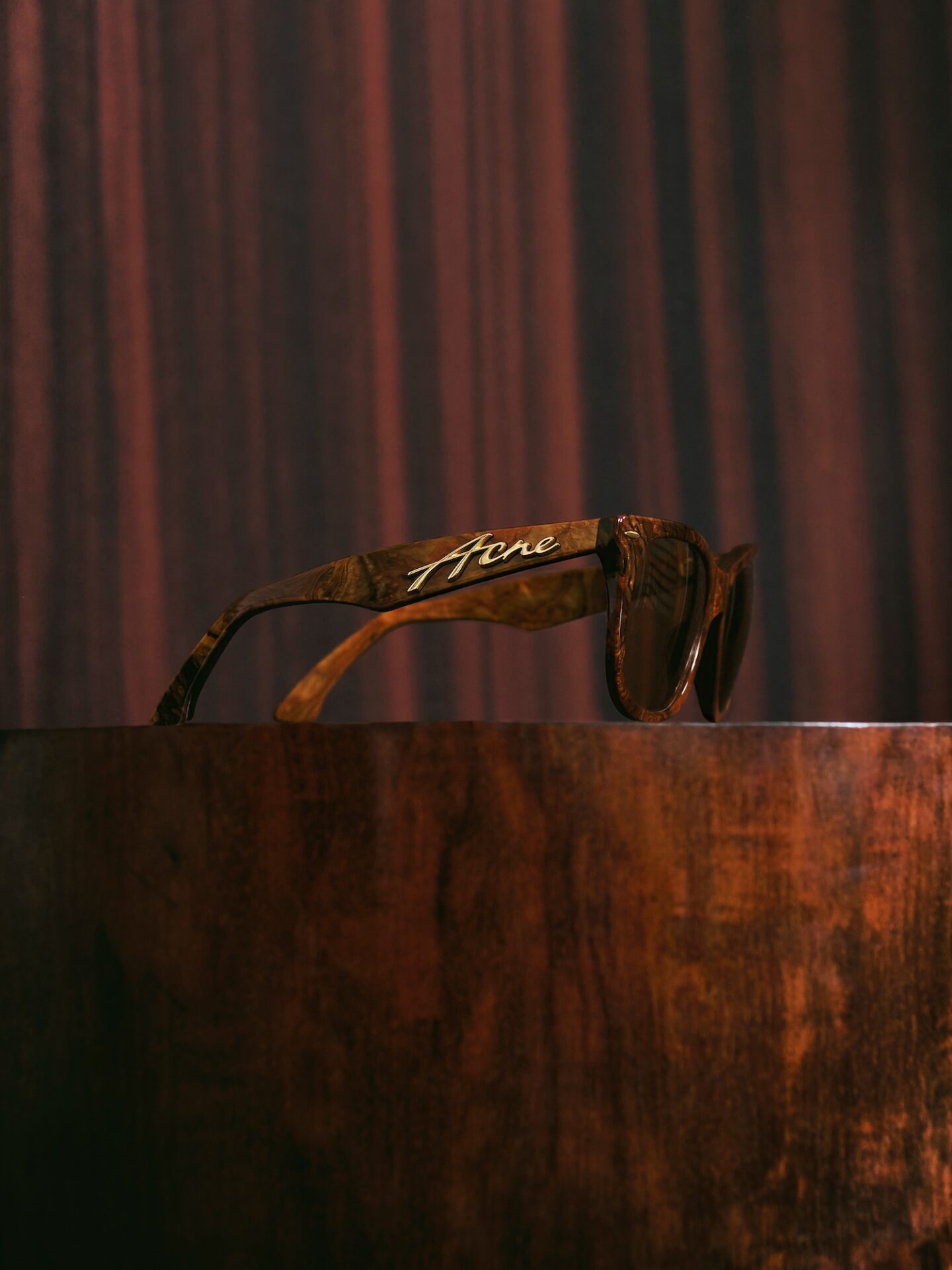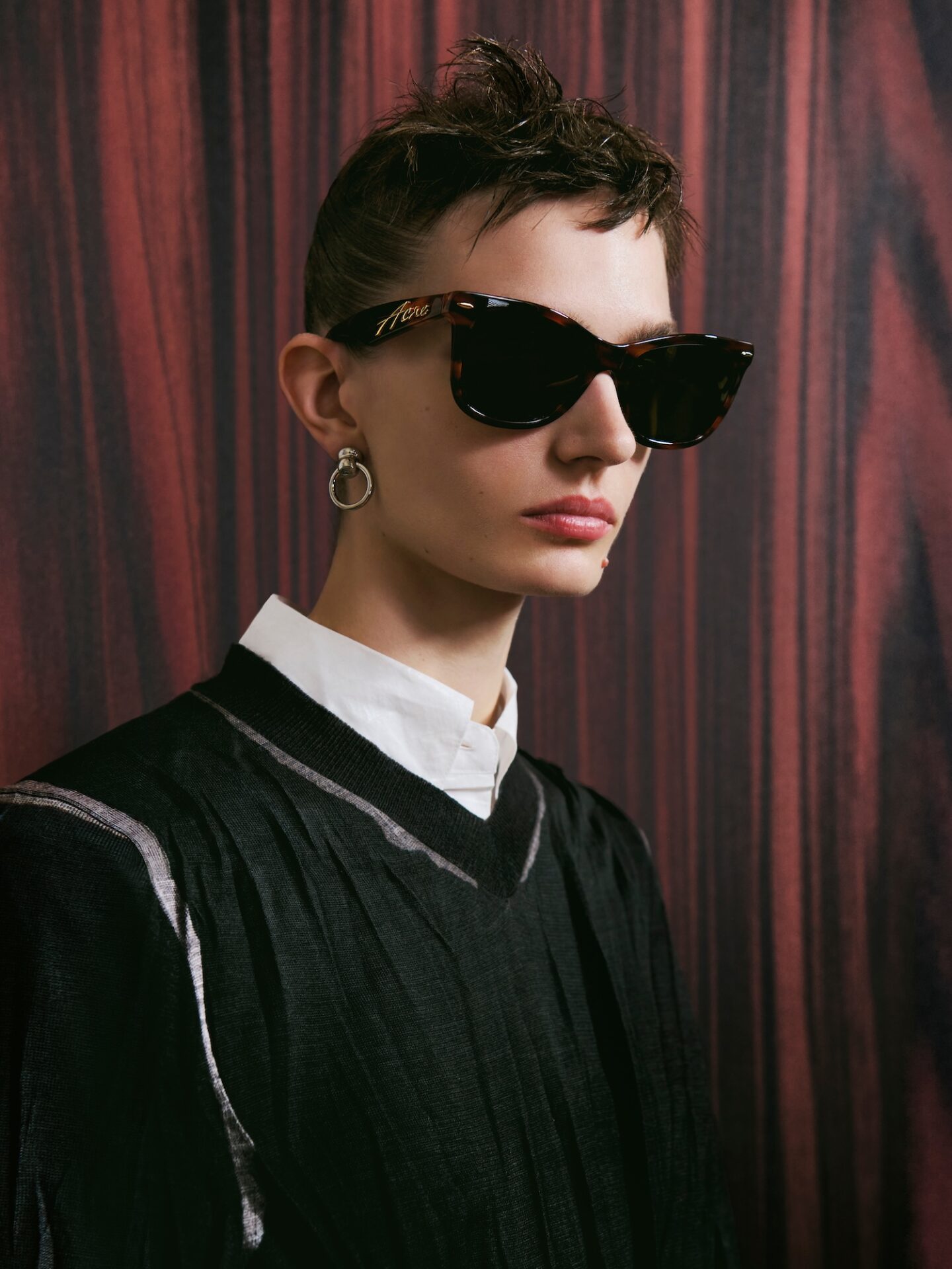 En contraste, la colección incorpora una montura escultural de acetato con volúmenes sobredimensionados. Introducida en el desfile de mujer, esta gafa eleva una forma clásica de uso diario con proporciones atrevidas y una fuerte identidad visual. Está disponible en negro y oro marrón.