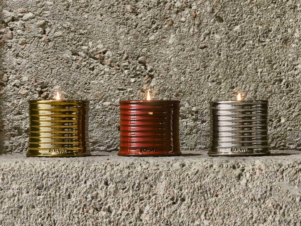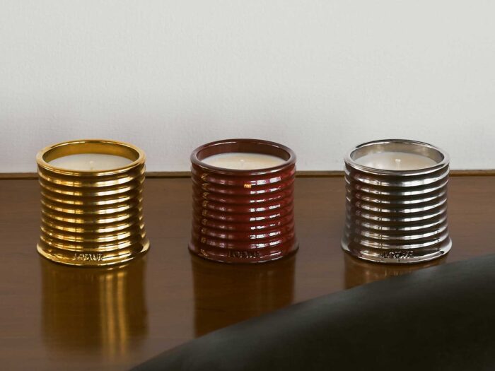 Las tres velas se presentan en recipientes esmaltados en Silver, Gold y Gloss Red, con el sello distintivo del Anagrama de LOEWE grabado en la base. Cada pieza, elaborada en terracota artesanal y vertida con cera natural y mechas de algodón, reivindica la belleza de lo imperfecto: no hay dos exactamente iguales.