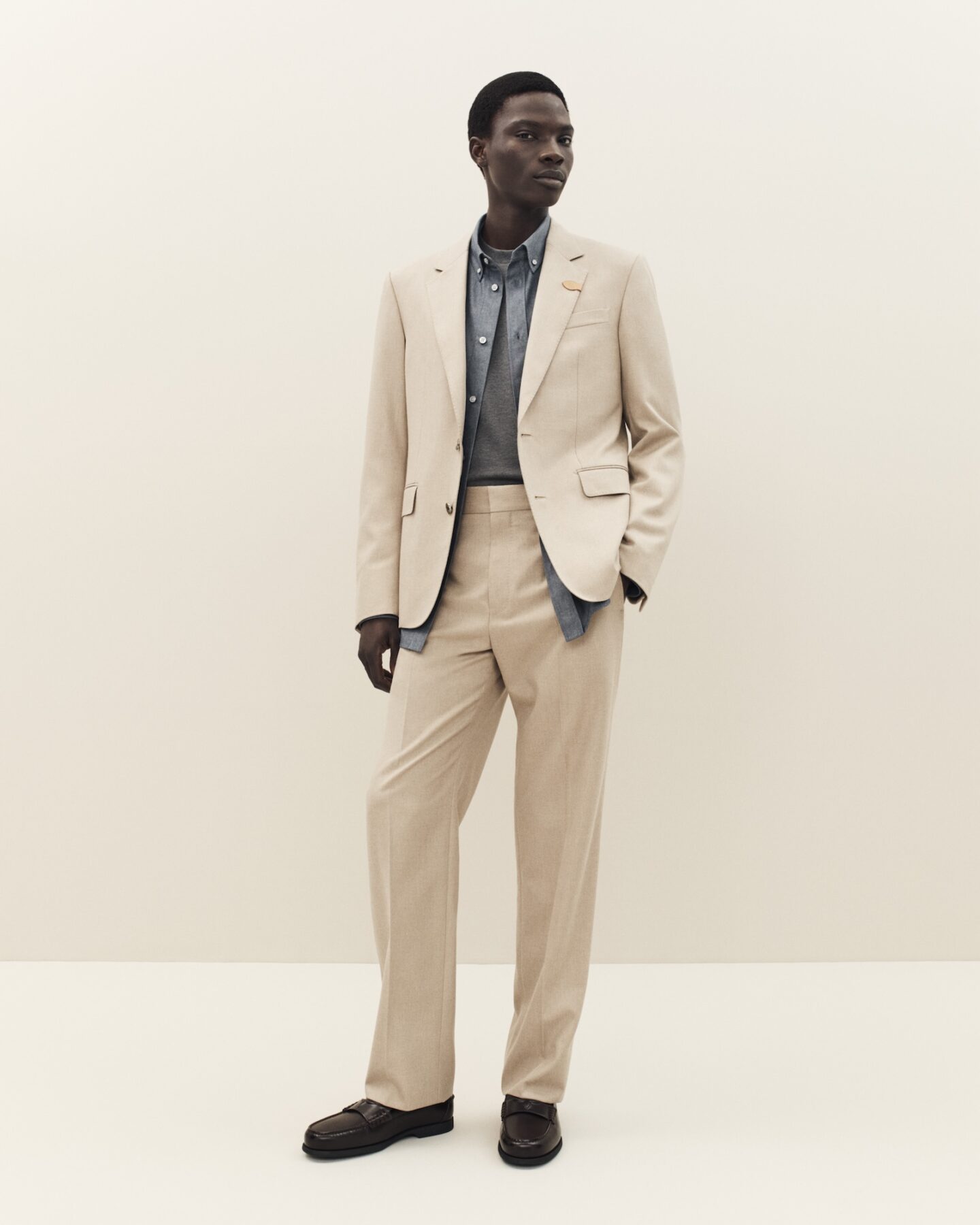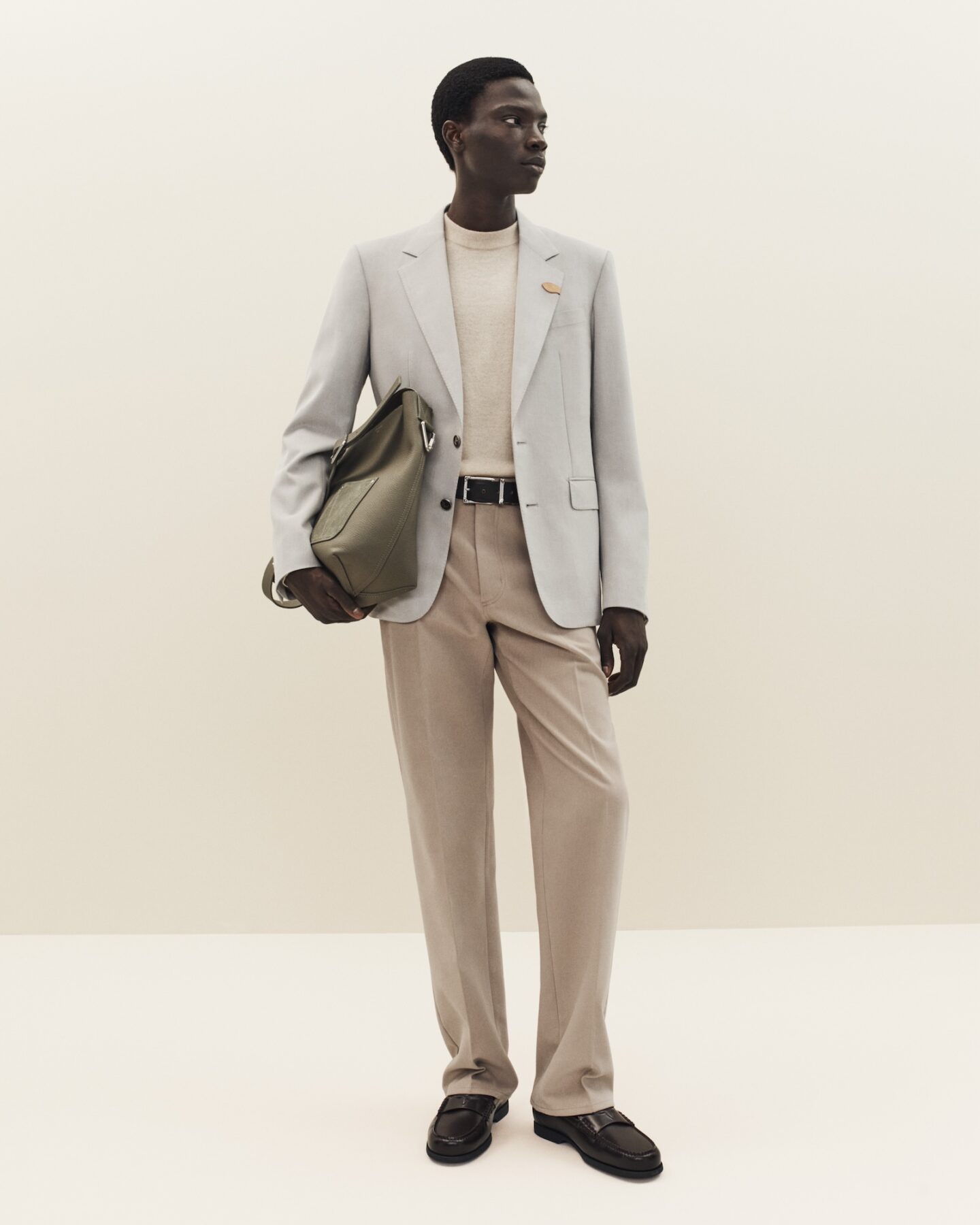 La propuesta sartorial captura la esencia de la línea con soltura contemporánea, ofreciendo trajes en lona transpirable de seda y lana que equilibran durabilidad y elegancia; versiones en mezcla de seda y cachemira que aportan ligereza y refinamiento; y blazers en doble faz de lana y cachemira, sin forro, para un ajuste flexible y ligero.