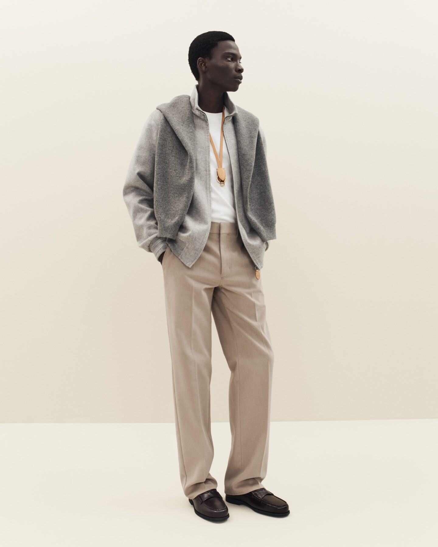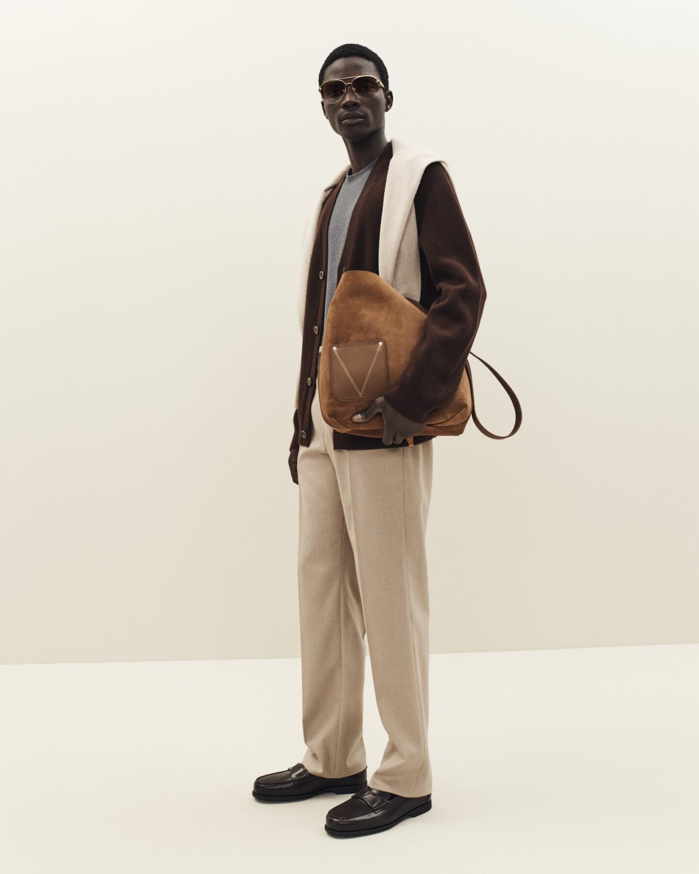 La dimensión urbana se expresa en una chaqueta tipo field en seda doble faz, un abrigo en cachemira cepillada doble faz y una chaqueta de inspiración workwear en mezcla de lana repelente al agua. Las camisas versátiles incluyen chambray ligero de algodón y seda de tacto suave, así como sarga ligera de cachemira y seda con rayas múltiples para superposiciones sofisticadas. Un traje desenfadado compuesto por sobrecamisa y pantalón a juego en crepé doble faz de algodón y seda refuerza la estética contemporánea. Los pantalones en gabardina doble de algodón y seda -ligeramente cepillados para un tacto efecto melocotón- trazan líneas estructuradas pero elegantes. El punto se materializa en cárdigans y jerséis acanalados de cachemira, polos de manga larga y corta en mezclas superfinas de cachemira, seda y lana, o en piqué de seda y algodón con motivo Damier.
