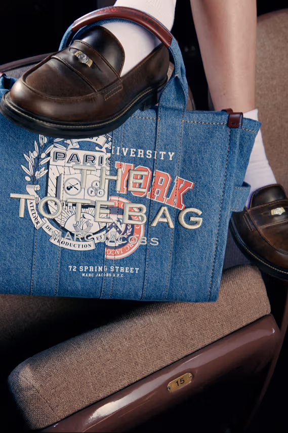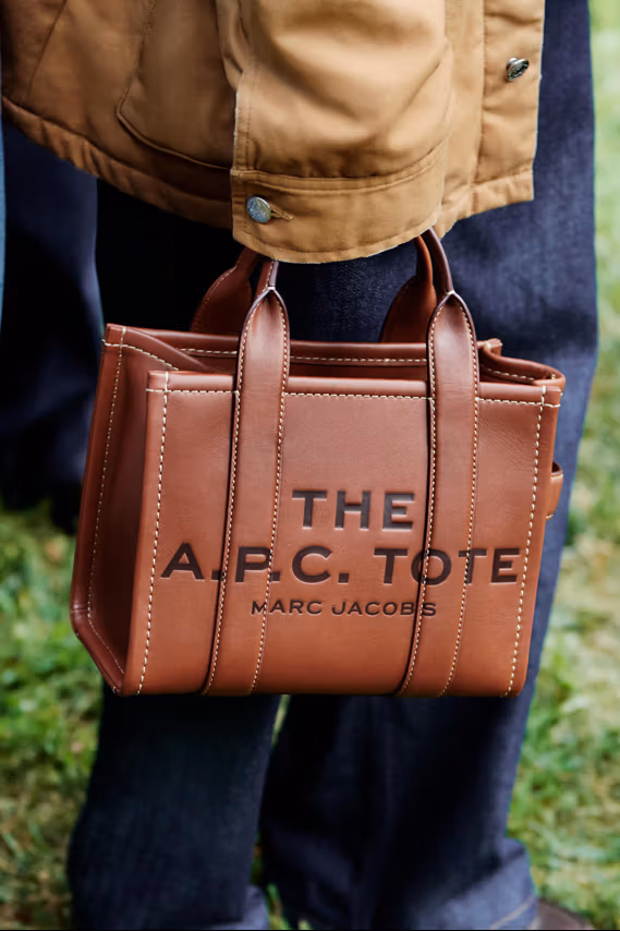 En accesorios, la tote bag de Marc Jacobs se transforma en «The A.P.C. Tote» en piel marrón. La Varsity Tote combina patchwork de denim con los escudos de la colaboración. Un mocasín marrón de cuero, acompañado de una moneda de edición especial, cierra la colección con un guiño clásico y elegante.