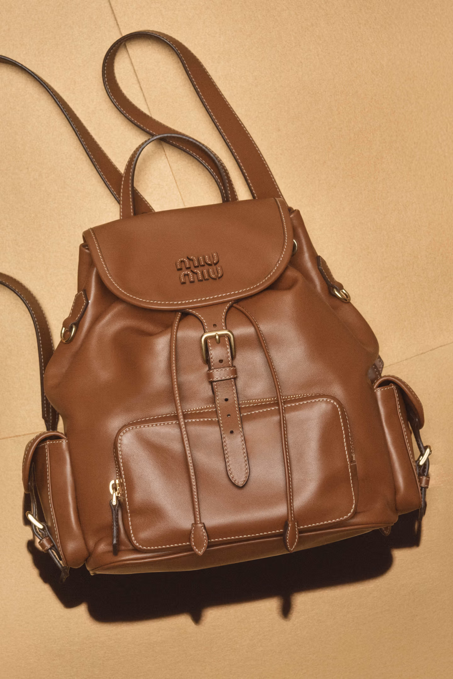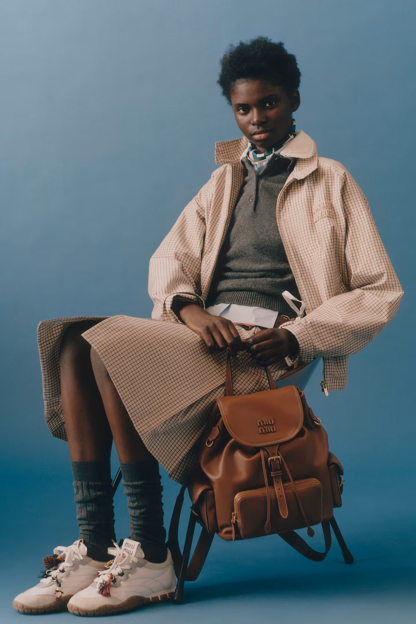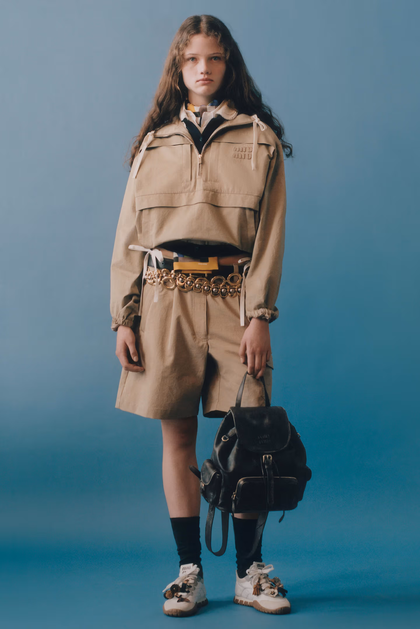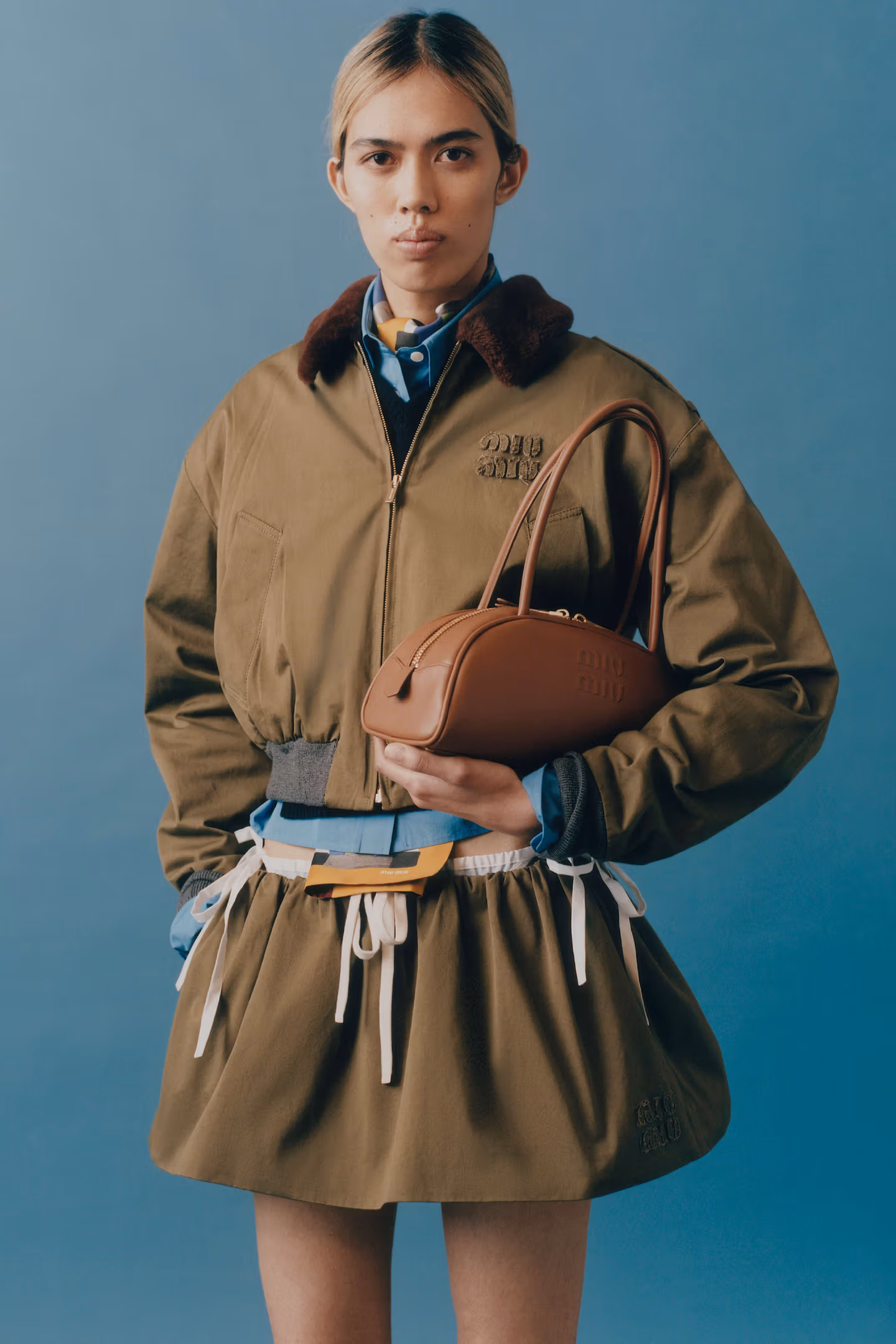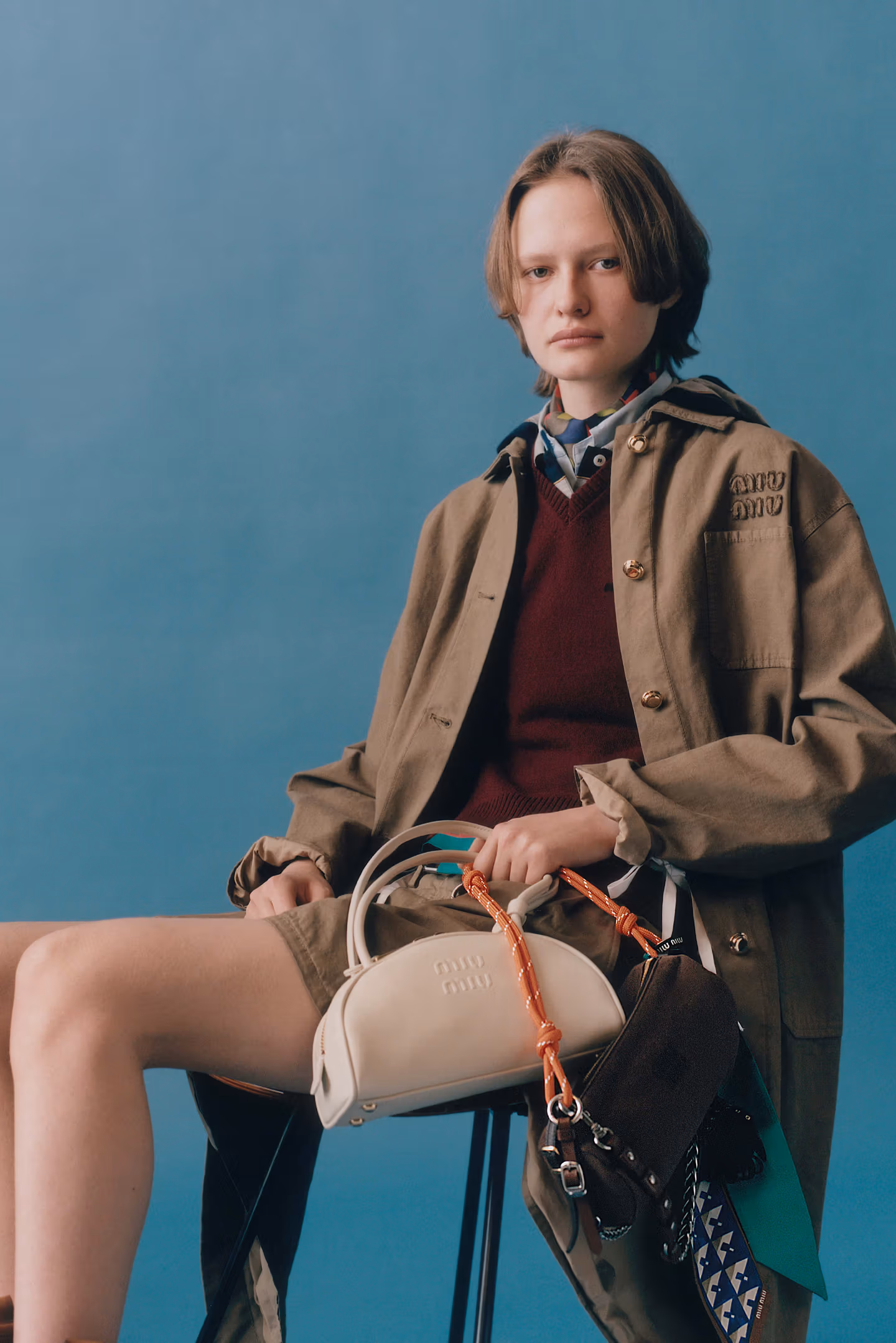La colección se completa con una cuidada selección de accesorios. Entre ellos destacan el Arcadie bag, el Beau Bowling bag y varias mochilas que combinan practicidad y elegancia. En ready-to-wear, Miu Miu revisita algunos de sus clásicos: chaquetas de algodón canvas con logo, micro-minifaldas de volumen puffball y prendas de punto ajustadas. Todo se combina con polos de colores, creando looks frescos y reconocibles.