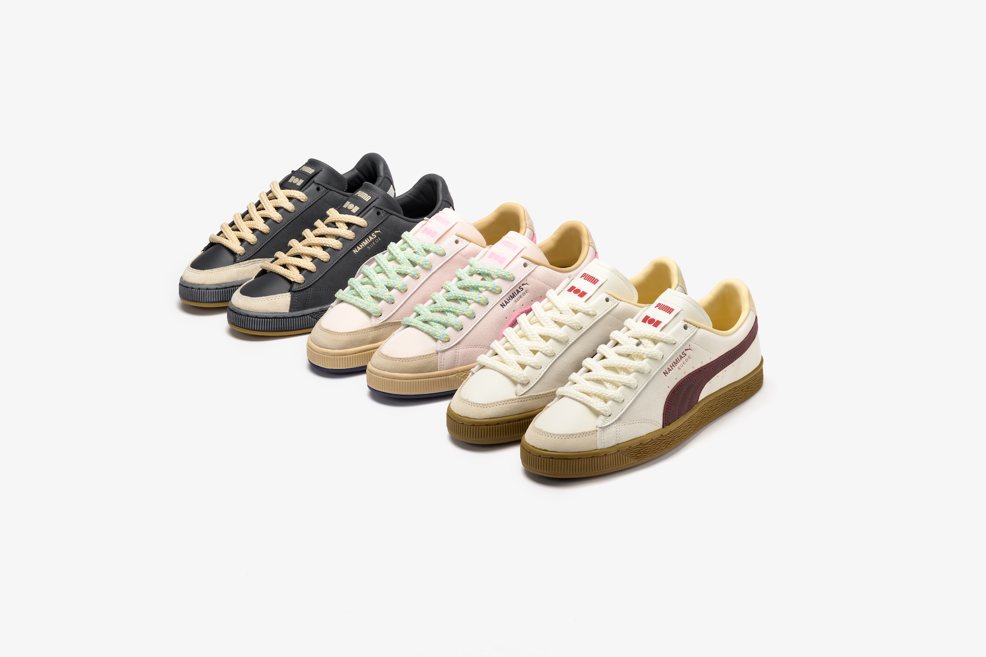 Bajo la dirección creativa de Doni Nahmias, las PUMA Suede se transforman en un lienzo donde conviven franjas de cuero desgastado, capas asimétricas de ante en la puntera y bordes de espuma a la vista que evocan un acabado casi DIY. El resultado es una silueta de espíritu vintage que respeta la esencia original del modelo, pero llevándolo a un terreno más expresivo y atrevido.