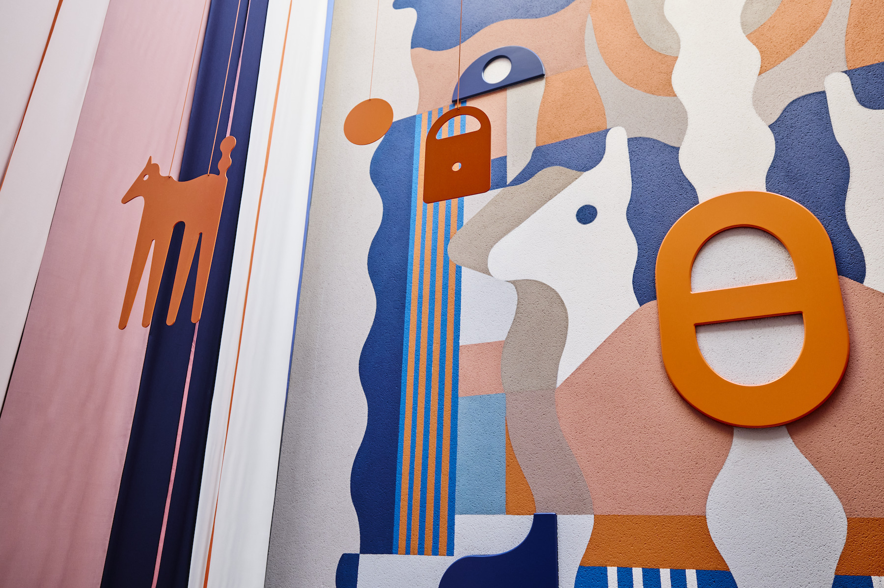 El recorrido continúa en el interior de la tienda, donde el patio interior se convierte en el «tercer escaparate»: un jardín vertical de seis metros que mezcla mural y textil, evocando mares, montañas, escenas ecuestres y rostros. Cada puntada y trazo se alinea con la herencia artesanal de Hermès, convirtiendo el viaje en un proceso creativo, donde seguir el hilo significa avanzar hacia lo desconocido.