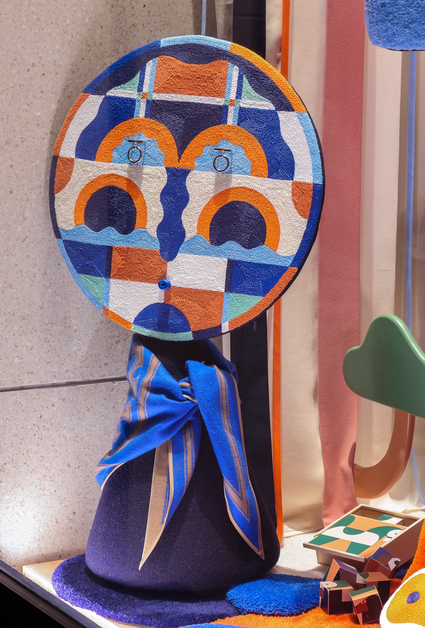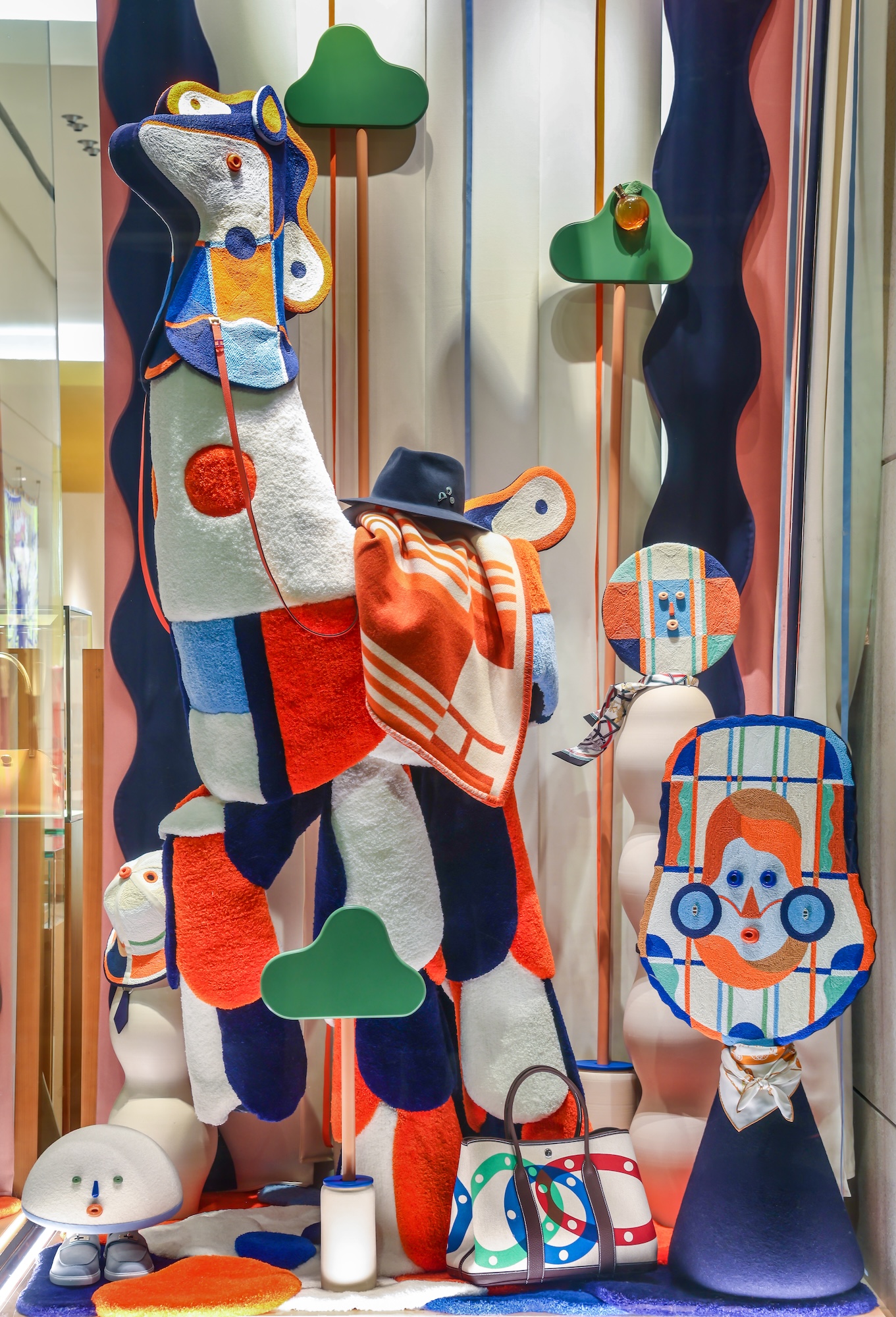 El recorrido continúa en el interior de la tienda, donde el patio interior se convierte en el «tercer escaparate»: un jardín vertical de seis metros que mezcla mural y textil, evocando mares, montañas, escenas ecuestres y rostros. Cada puntada y trazo se alinea con la herencia artesanal de Hermès, convirtiendo el viaje en un proceso creativo, donde seguir el hilo significa avanzar hacia lo desconocido.
